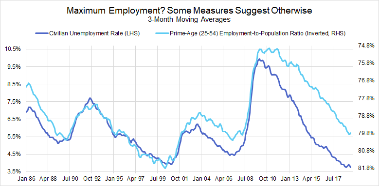 Recent research also suggests that the unemployment rate is a flawed proxy for gauging additional labor supply available. Ahn and Hamilton (2019) show that the distinction between those who are unemployed and those who are classified as not in the labor force is not well-defined within the CPS, and it tends to result in an underestimation of both the unemployment rate and the participation rate. The prime-age employment-to-population ratio, while imperfect in its own ways, was more robust to these muddy definitional distinctions. A more careful look at Figure 12 would suggest that members’ claims of achieving “maximum employment” were far too hasty.