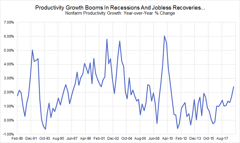 Real wage growth is supposed to be consistent with productivity growth, but the full extent of productivity gains are often only revealed after the fact, in the weakest moments of labor market activity. The realized productivity gains in recessions and jobless recoveries have not made their way back to labor compensation, or else we would not see such a historically depressed labor share of income. So while it is not a good reason to constrain future wage outcomes, a realized long-term productivity trend that spans a full business cycle can still serve as a reasonable baseline for real wage growth.