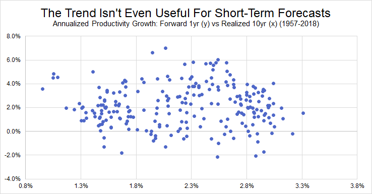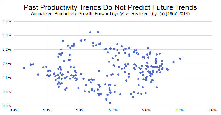 There is also little evidence that the realized long-term trend in productivity growth can predict future productivity dynamics. Whether it is for the next 5 years or just the next 4 quarters, Figures 14 and 15 highlight the dangers of extrapolating past productivity trends into the future. At the very least, it should not serve to constrain future wage growth when there is little evidence that past productivity gains have flowed back to workers.