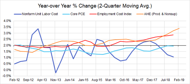 Innocuous as these remarks might appear, they do reveal skepticism about just how much wage growth could prove sustainable amidst low observed productivity growth. At the time of Chair Powell’s testimony, unit labor costs, which should adjust wages for productivity, were growing faster than 2%. If low productivity growth persisted, shouldn’t faster unit labor cost growth ultimately result in a corresponding price adjustment, thereby creating above-target inflation?