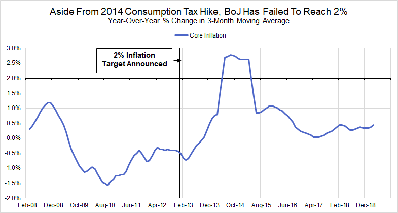 Japan has observed persistently low and often negative inflation rates for the past 25 years, but the political will to address it as a problem only emerged in December 2012 with the election of Shinzo Abe as Prime Minister. Since that time, the Bank of Japan has engaged in an ambitious strategy to achieve the singular goal of sustainably raising inflation to 2%. Unfortunately, the results suggest that the strategy has still failed to achieve its objective, and now the motivation for achieving the 2% target has faded. The Financial Times reported on a recent statement from BoJ Governor Haruhiko Kuroda: