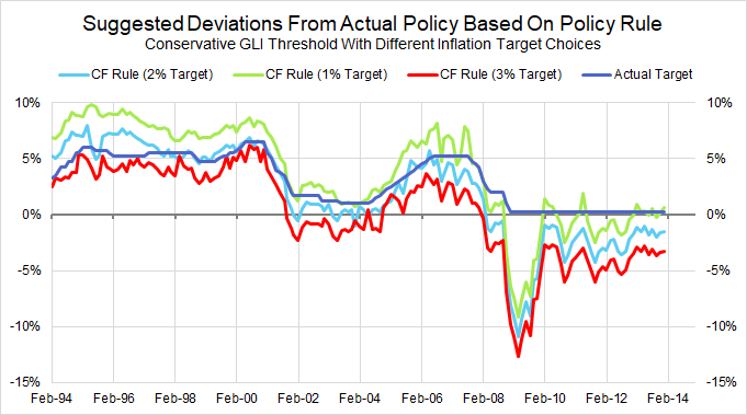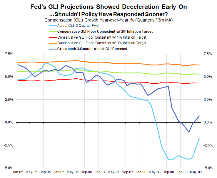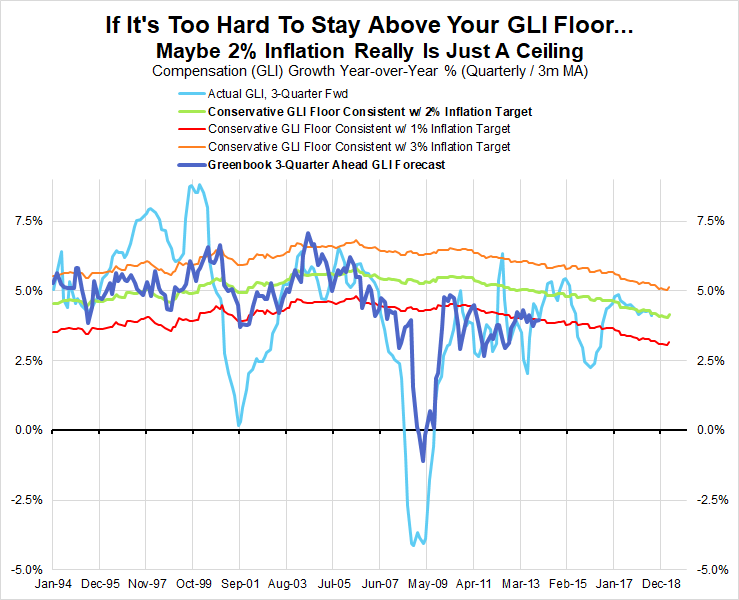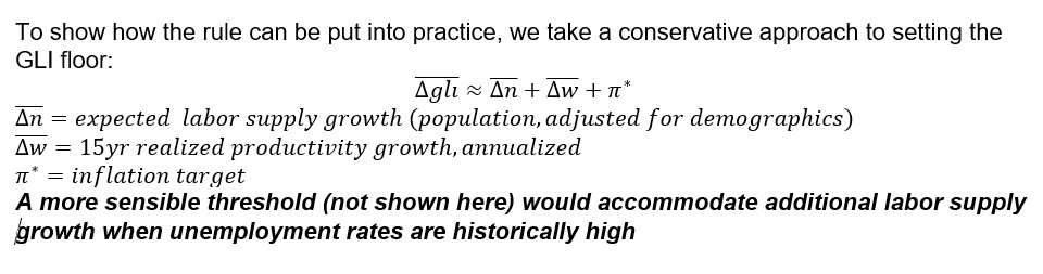 At that time, GLI growth was projected to be roughly 4.5%-5%, a sharp rise from previous projections but hardly impressive in the context of population growth and historically high unemployment. Even under the conservative specification of the GLI floor that assumed a 2% inflation target but ignored high unemployment, our framework would have still prescribed additional easing. Policy tightening under our approach would have required a GLI floor with a much lower assumption for the inflation target, closer to 1%, or a lower threshold for real wage growth.