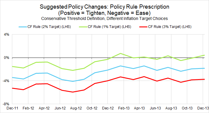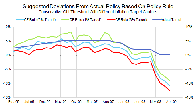 By using the rule in Figure 20 that (unrealistically) assumes forecast certainty, we can compare the rule’s prescriptions under a variety of inflation target assumptions with what actually transpired, as shown in Figure 24.