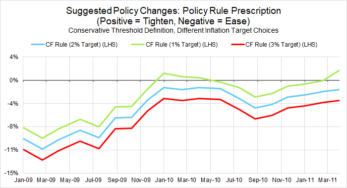 There are minor issues associated with mixing nonfarm and aggregate measures and adjusting for the opaque policy assumptions that underlie these forecasts, but the forecasts used in this exercise should not be particularly sensitive to these issues. The approach to using the Fed staff’s forecasts is consistent with the approach in Chair Bernanke’s January 2010 speech for working with forward-looking Taylor Rules.