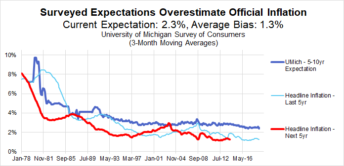 Figure 1 shows that long-term inflation expectations among consumers surveyed by the University of Michigan have a substantial upward bias relative to the official inflation rate. After adjusting for the bias, the most recent reading for long-term inflation expectations — a 40-year historic low in the survey’s history — implies inflation outcomes about 1% below the Fed’s target. With inflation outcomes already underperfoming the Fed’s target and expectations sliding, is the solution simply for the Fed to aim for higher inflation?