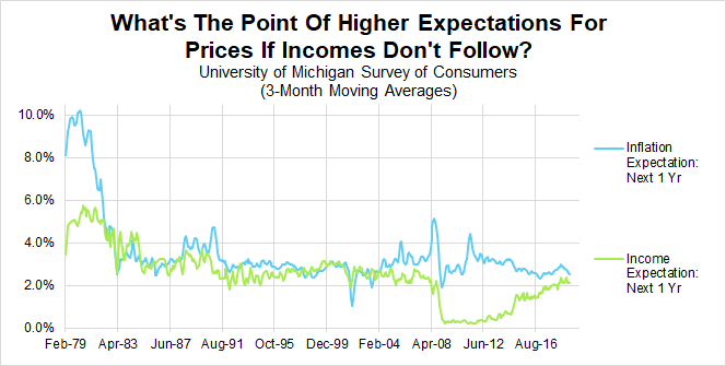 If a central bank’s attempt to increase expectations for prices was not met with a corresponding increase in expectations for income, household spending behavior might grow more cautious, ultimately undercutting the central bank’s original effort. Figure 2 confirms that the two can disconnect, and in ways that would seemingly constrain spending behavior and inflation outcomes.
