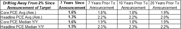 A formalized inflation target is a relatively new phenomenon in Fed history. Even after the Fed began using the deflators for Personal Consumption Expenditures (PCE) to evaluate its inflation performance, FOMC members still held differing views on the optimal inflation target. Only at the January 2012 meeting did they announce a 2% target, with the hope that such an announcement would reinforce its target:
