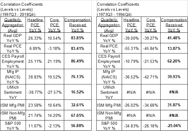 At the risk of sounding blasphemous about mainstream macroeconomic theory, consumer price inflation isn’t robust enough as an indicator to serve as the central motivation for all Fed policy decisions. Among the major sets of cyclical indicators, consumer price inflation is arguably the most disconnected and uncorrelated. Even when inflation does exhibit cyclical sensitivity, it often lags by several quarters and makes the communication of policy especially complicated if current inflation readings are at odds with more timely indicators. Finally, the methodology for calculating consumer prices is in constant flux. New price datasets and techniques for adjusting prices for quality change are regularly being introduced to an increasing share of inflation components. All of this makes it harder to disentangle what official inflation readings tell us about the current environment. GLI, which can be captured by the “Compensation of Employees” series in the monthly Personal Income release, is superior on all three counts: it is more sensitive to cyclical dynamics, it is more coincident to business cycle realities, and it follows a more stable methodology.