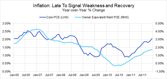 The summer of 2008 is perhaps the most glaring example of how inflation lags. Core and headline inflation were running above 2% even though other nominal and real measures of activity suggested a deteriorating economic trajectory. In each of the past three recessions, inflation troughed well after labor market activity measures. Even in non-recessionary periods such as 2011, rising inflation was ultimately a sideshow relative to the economic deceleration and elevated recession risk that policymakers needed to head off.