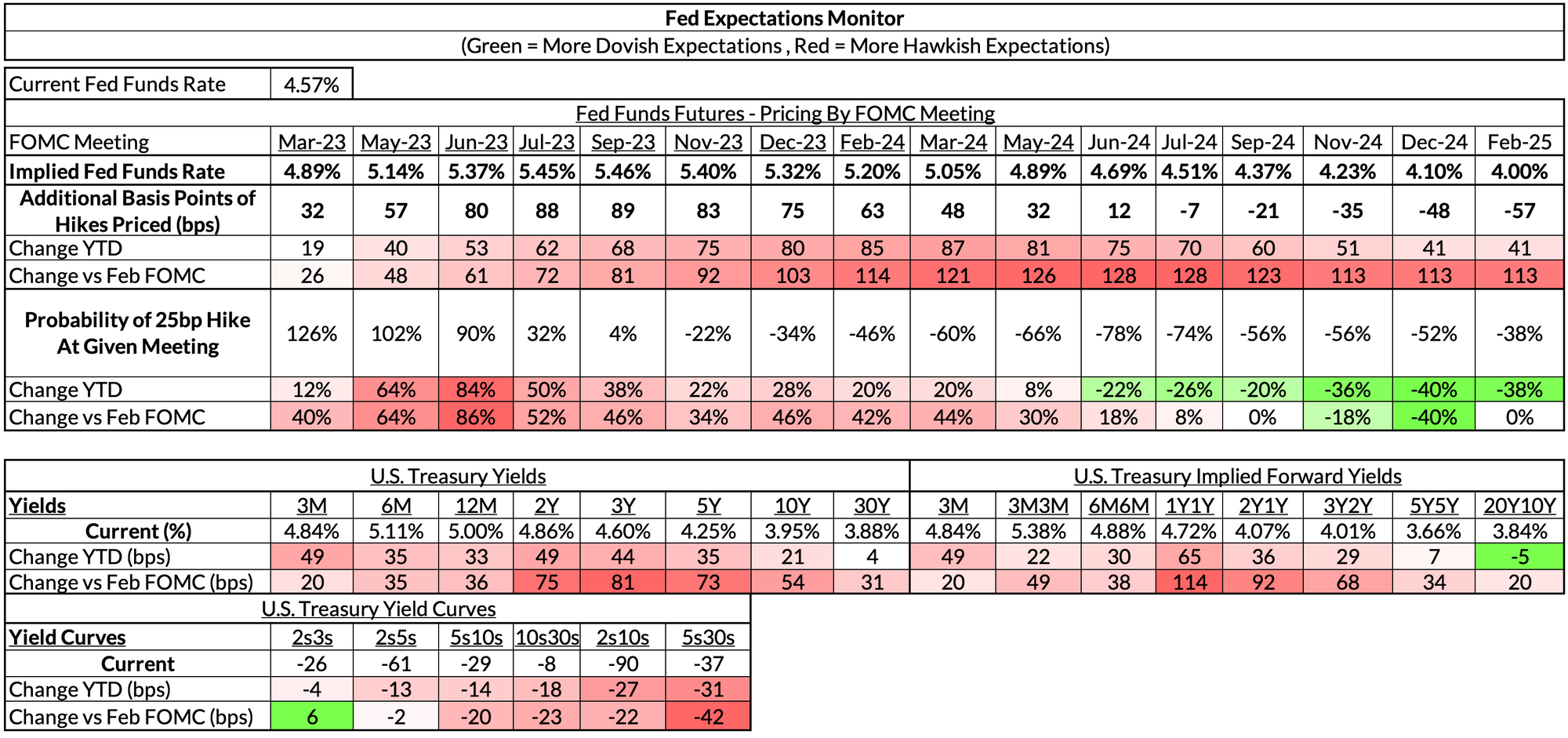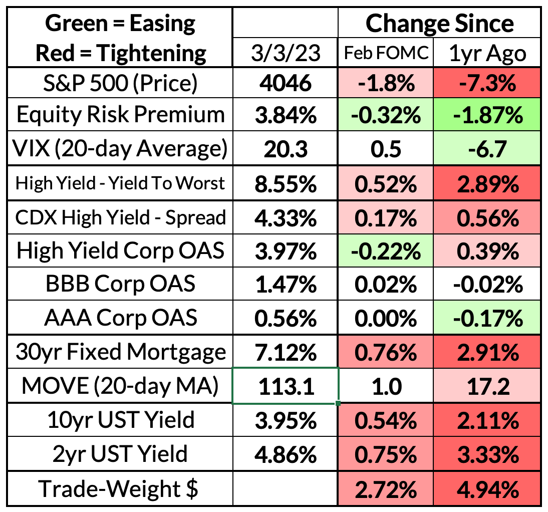 Financial conditions have tightened since the February FOMC meeting largely in response to stronger growth and inflation information. This certainly does not seem like a recessionary tightening of financial conditions. At an asset class level, Treasury yields, credit spreads, and the dollar are the source of tightening. In the context of hot PCE inflation, resilient US growth, and market-implied expectations of both, it is not a surprise for Fed policy rate expectations to also rise.