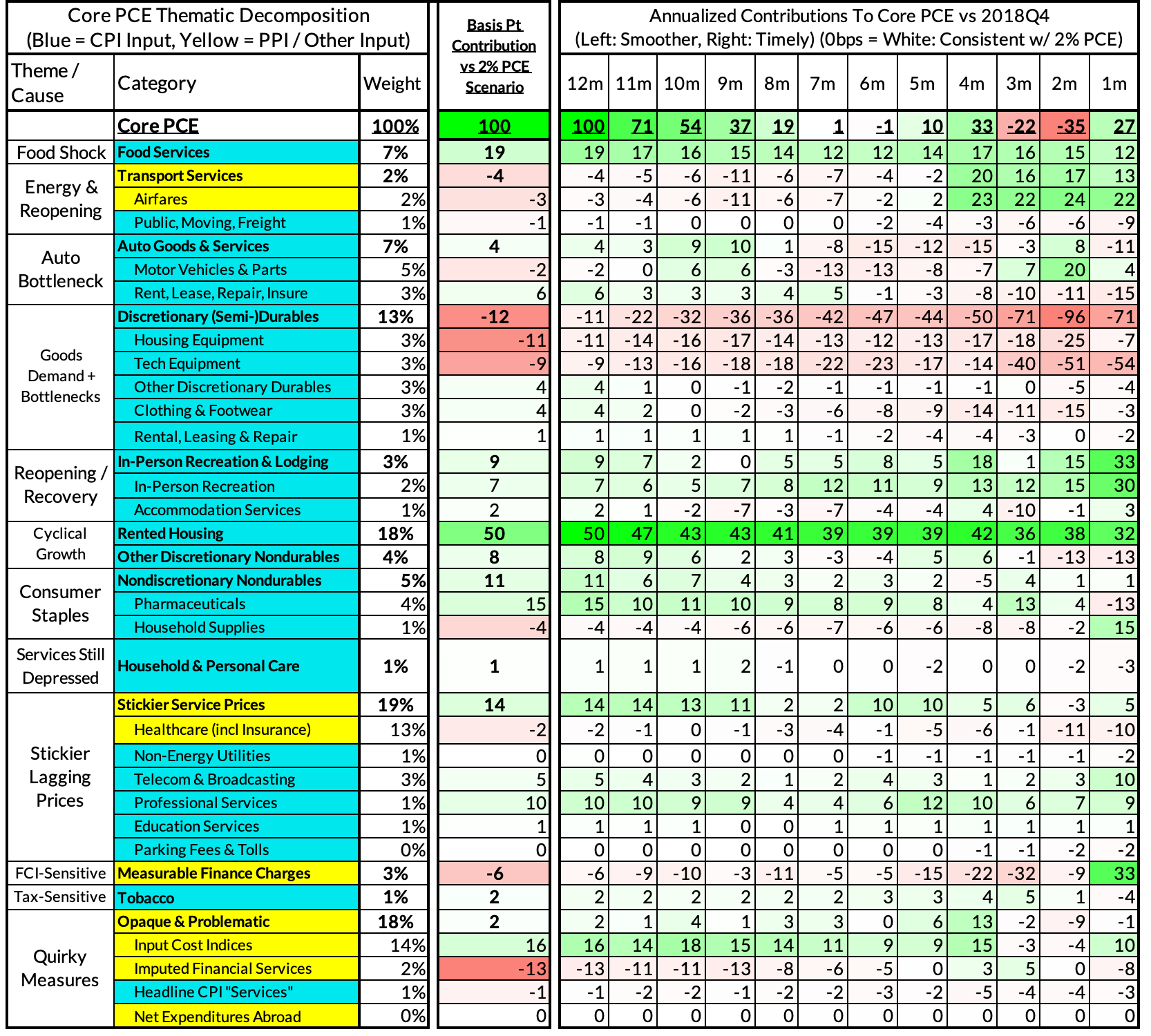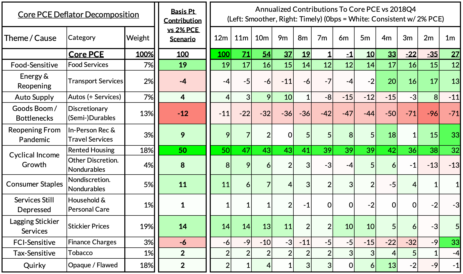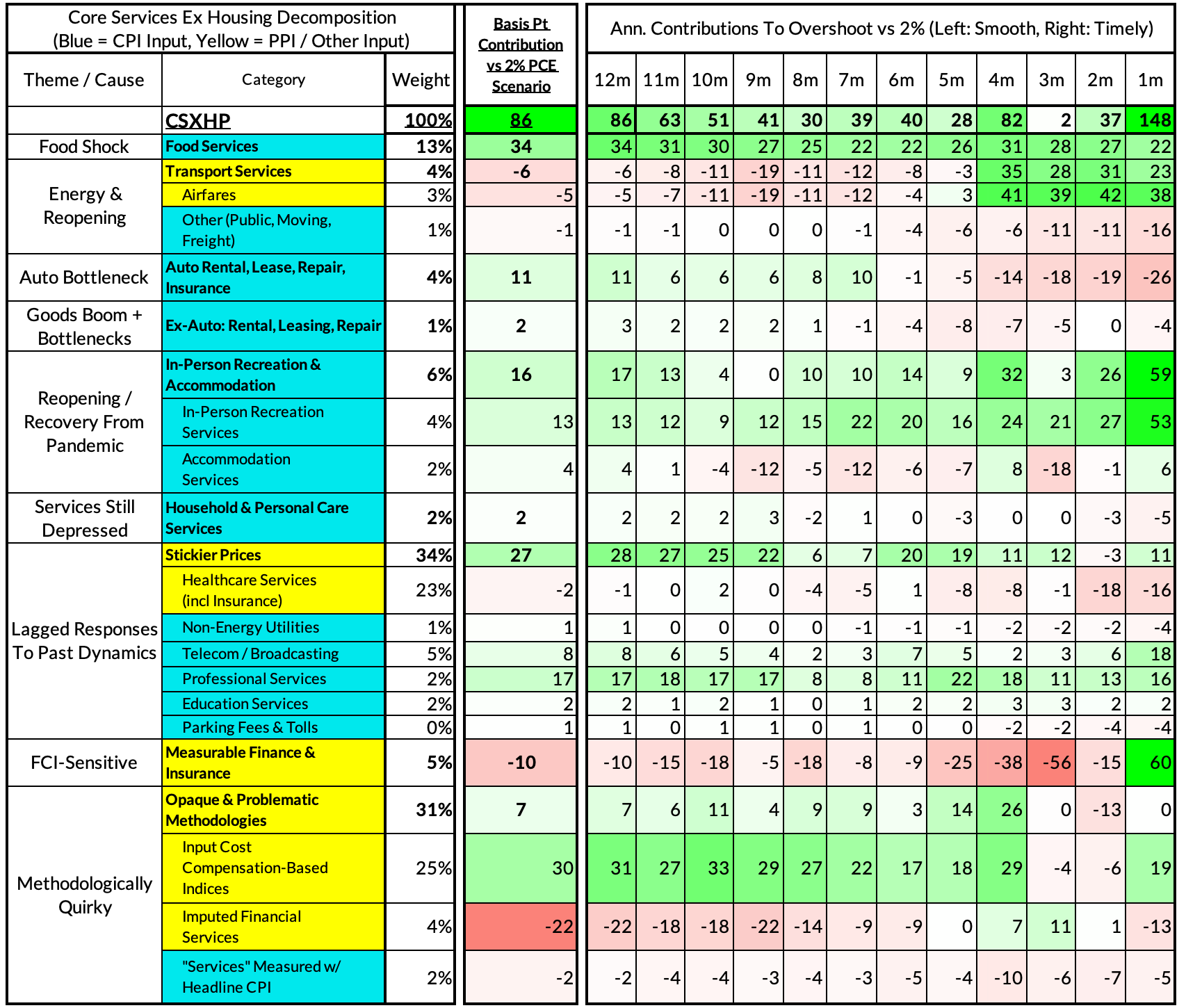 - Some oddball segments have offsetting effects (measured financial service charges now subtracting 6 basis points, while contributions from input cost indices and imputed financial services likely adding 3 basis points to Core PCE vs 2%-consistent outcomes).