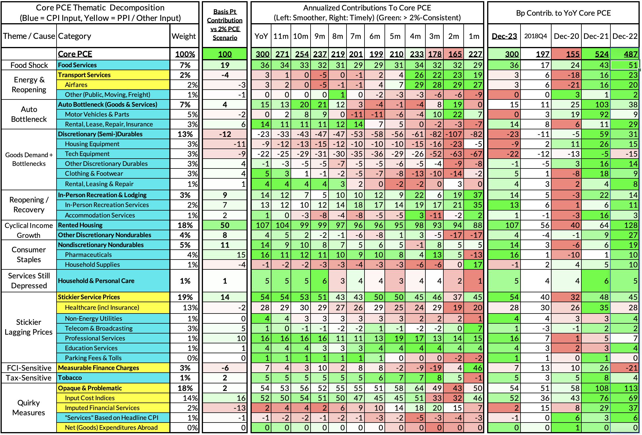 Core-Cast is our nowcasting model to track the Fed's preferred inflation gauges before and through their release date. The heatmaps below give a comprehensive view of how inflation components and themes are performing relative to what transpires when inflation is running at 2%.