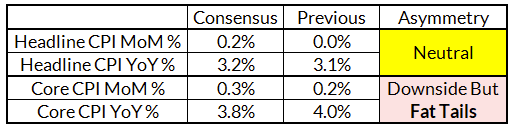- Our biggest warning heading to the January batch of inflation data is that the tails are fat. To be precise, the odds of a large upside and downside surprise are elevated relative to most other months. While the revised seasonal factors suggest mild downside skew relative to the consensus forecast, the plausibility of tail risk outcomes on Tuesday are high on both sides of the distribution. Our bottoms-up forecast for core CPI is 0.24% month-over-month gain, relative to a consensus forecast of 0.3%.