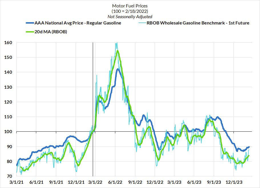 - Why are the tails fat? Differing theories for residual seasonality. The heat in the last two January CPI releases (2022, 2023) could be explained in two ways. The first was that post-pandemic seasonal patterns had shifted to load more price increases into the beginning of the new calendar year. If so, the seasonal factors could still be playing "catch up" and cause seasonally adjusted estimates of inflation to continue looking hot in January and February. An equally plausible alternative theory is that those hot inflation prints were closer to a "lagged cost push" effect as firms played catch up on final pricing relative to cost pressures brewing in the previous 9-10 months (also explains why the residual seasonal strength was concentrated in goods pricing). If so, the absence of major cost push pressures in the last 9-10 months should support much cooler inflation outcomes. We are taking a weighted average of the two theories in our bottoms-up forecast.