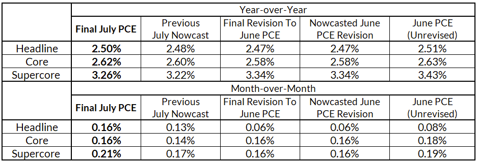 There's not a lot we learned today. Our nowcasts for July Core PCE were ultimately 2 basis points too low but that is well within a standard error. Our modeling of Q2 PCE revisions at the monthly level proved to be highly accurate. The takeaways this month are that we're continuing to see slowing in services inflation, particularly outside of housing. The Fed has additional confidence to proceed with a cut in September. The August jobs report will and should be the primary determinant for how much easing is worth pursuing.