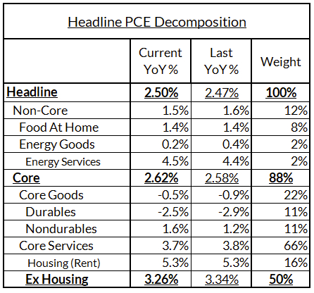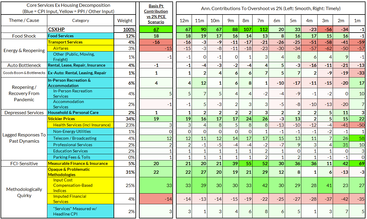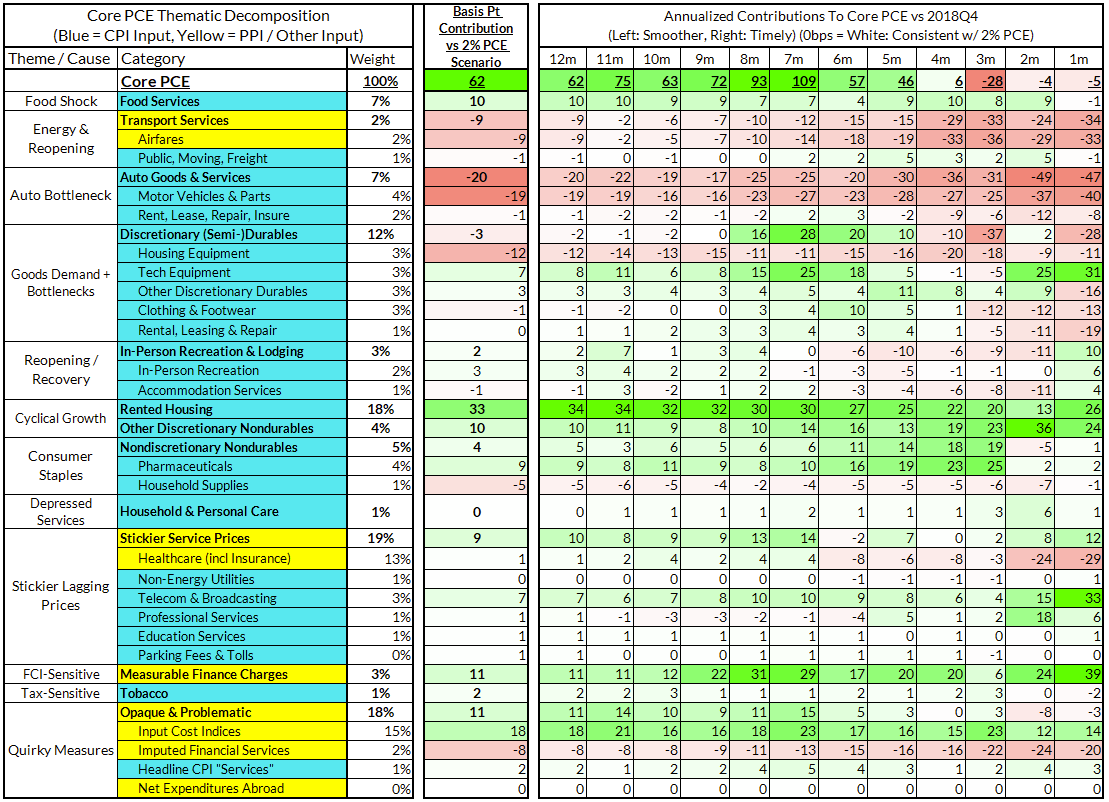 - Some oddball segments have offsetting effects (measured financial service charges now likely adding 11 basis points, while contributions from input cost indices and imputed financial services likely adding 10 basis points to Core PCE vs 2%-consistent outcomes).