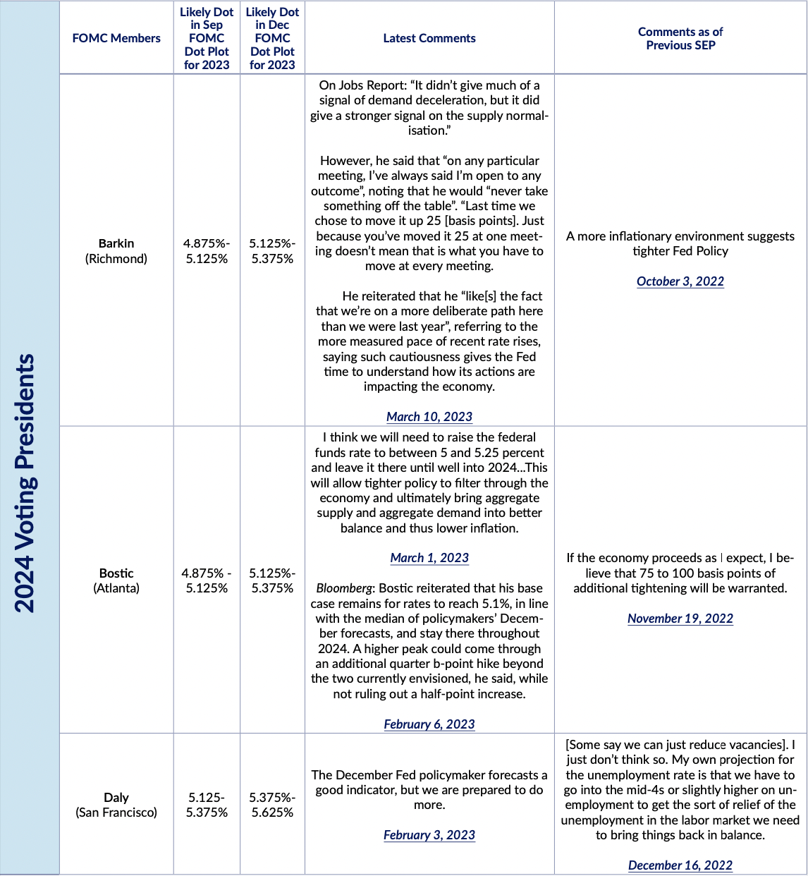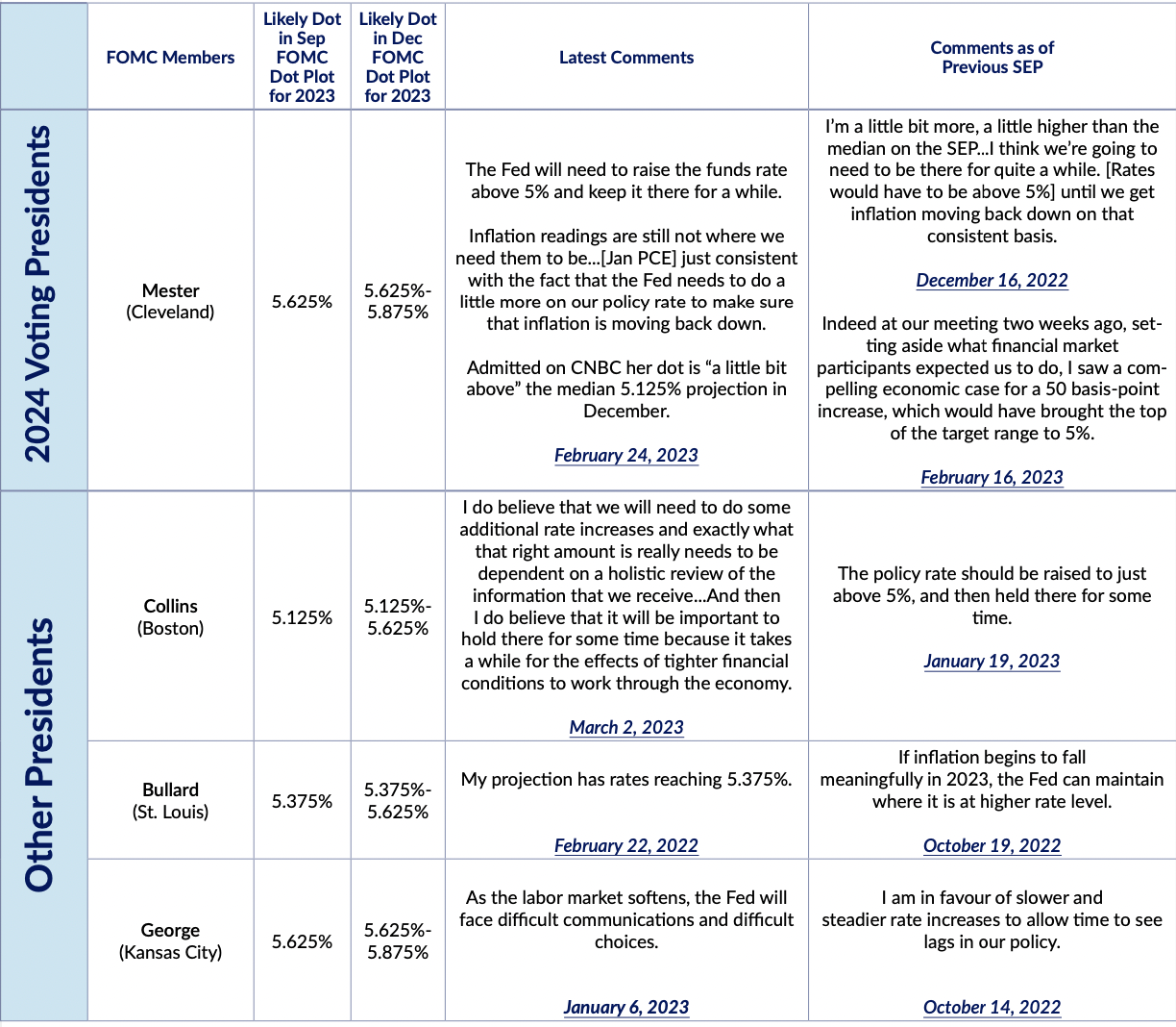 - The inflation data from since the last meeting has been discouraging, with core services still running hot, market rents not yet feeding through to CPI rents, and the goods deflation cavalry not arriving. In the absence of the SVB event, Chair Powell seemed keen to reaccelerate the pace of hiking with a 50 basis point hike. We expect that used car prices will surge in the upcoming 2-3 CPI releases, fomenting more risk that the Fed continues to keep policy tight longer than is optimal for long-term stability.