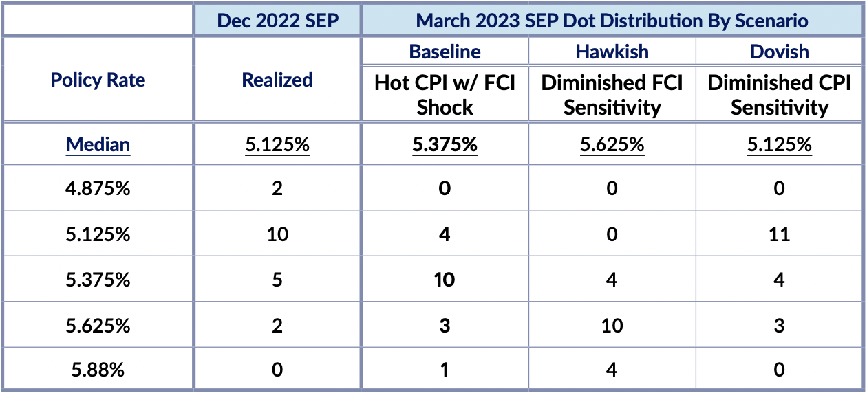 - Market pricing currently implies a 60% chance of a 25 basis point hike at the March FOMC meeting, but we see a marginally stronger base-case for a pause. In light of ongoing banking crisis challenges, the Fed’s own assessment of the banking system matters (they have informational advantages over market participants in assessing the state of the banking system). Recent Boston Fed President Eric Rosengren’s own concern and call for a pause likely reflects some FOMC members’ views right now. Of course following the market is always the easier call and may prove more prudent, but if there’s a time for the Fed not to follow market pricing, this meeting might be it. The entire FOMC was clearly blindsided by this dynamic and likely still wrapping their heads around its potential scope and scale. If the Fed does pause hikes in March, we would still expect it to be coupled with dots that signal an additional hike (maybe two) in 2023, with Chair Powell explicitly making further hikes contingent on arresting the risk of runs across the banking system.