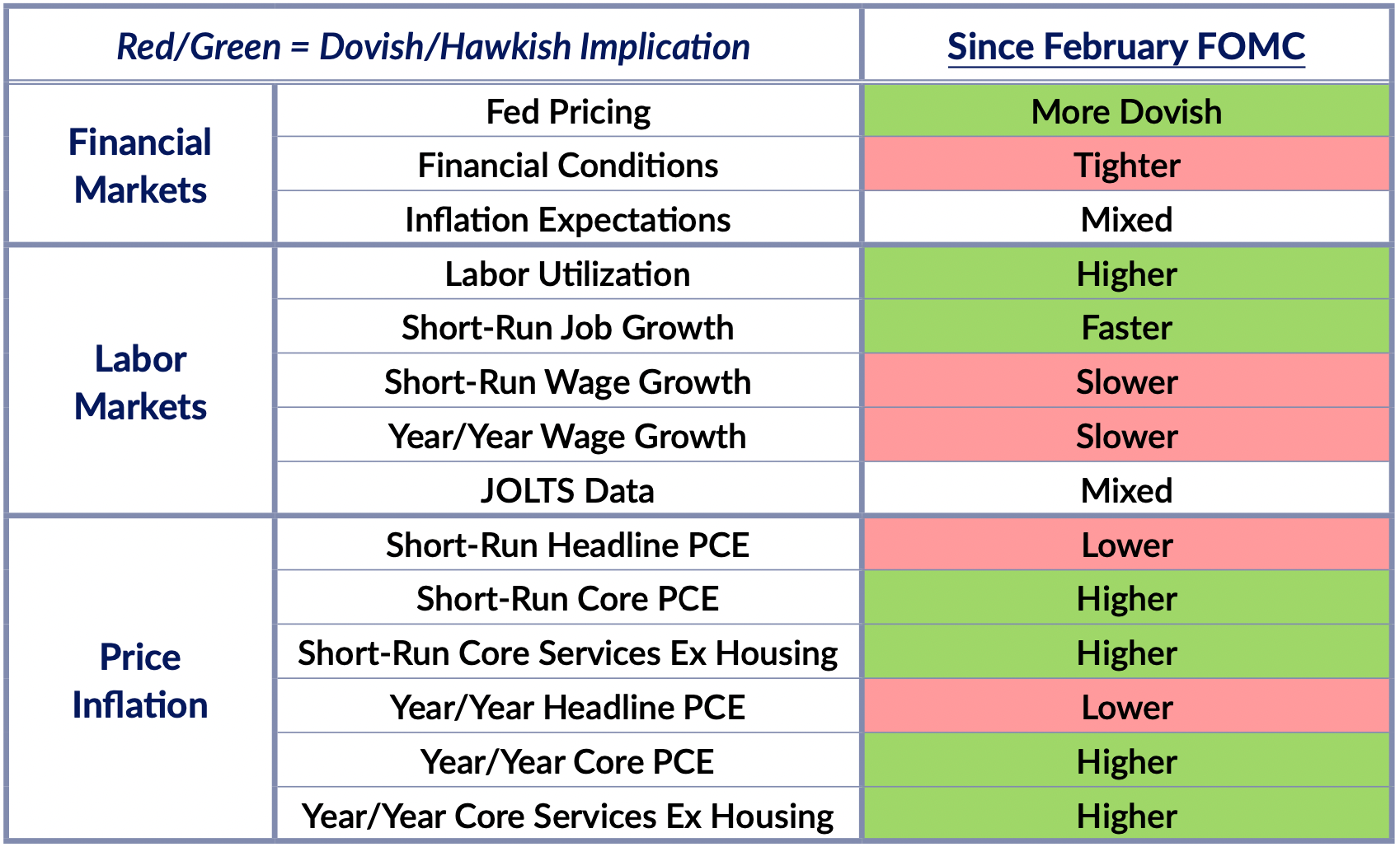 - Income trends continue to show more signs of normalization even if there is less progress on prices; given the uncertainties associated with rapid tightening a 50 bp hike never made any sense. Just before the Fed’s February FOMC announcement, we got the 2022 Q4 ECI print, showing significant wage deceleration during the end of 2022. We’re still in somewhat foggy territory until the next Employment Cost Index print, but the labor market story over the past few months has mostly been about strong but slowing employment, cooling quits and hires, and slowing wage growth in lower-tier wage measures. Even if the slowing wage growth hasn’t translated to disinflation in the core services sector (contra the Fed’s wage-driven views), lower income growth should reduce forward consumption growth and demand-side inflationary pressure in the aggregate (very hard to parse how this will split between goods and services). In the absence of banking panics, our framework would likely prescribe incremental financial conditions tightening (growth is cooling but still above our threshold floor; inflation risks are elevated).