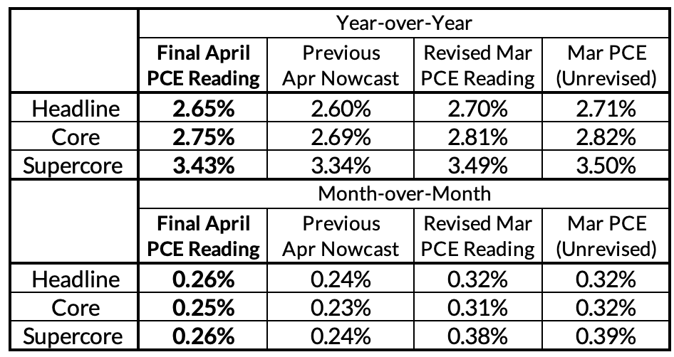 Our nowcasts were a little under-baked as a result of presuming too much of a decline in food services and airfares (seasonal factor translation issue), and an imperfect mapping of yesterday's revisions to the Q1 PCE data. Nevertheless, year-over-year readings across all major PCE inflation gauges fell from March to April as last year's higher monthly inflation readings continue to roll off.