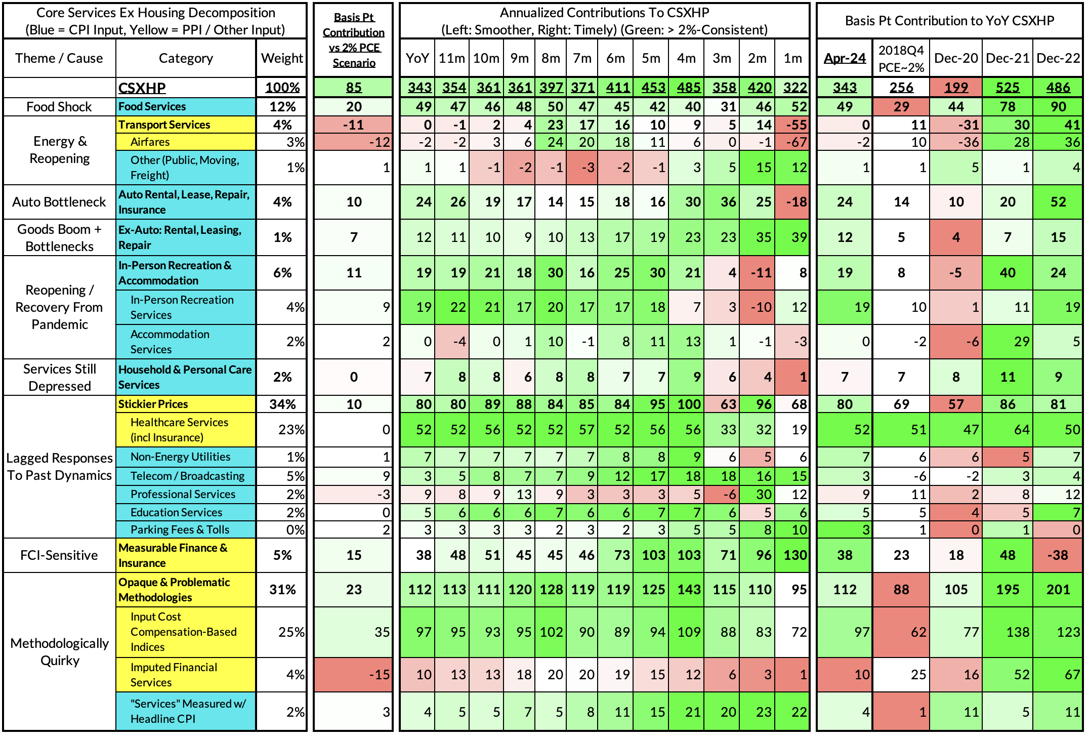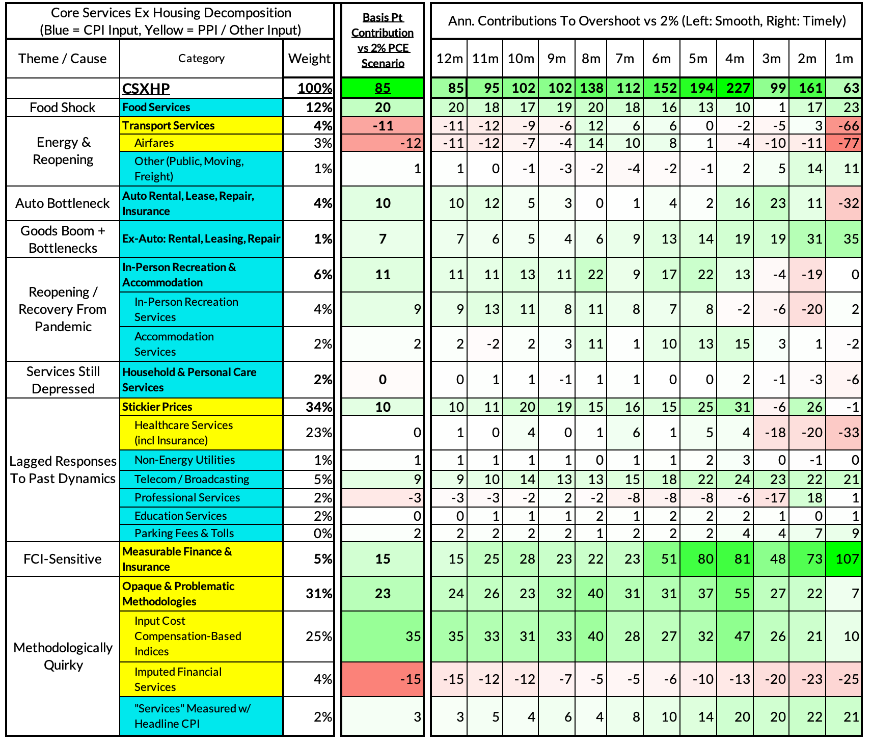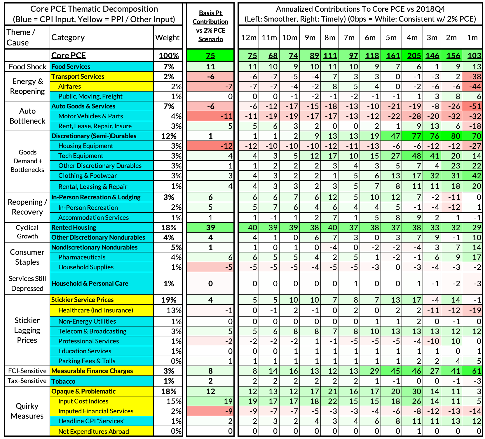 - Some oddball segments have aggravating effects (measured financial service charges now likely adding 8 basis points, while contributions from input cost indices adding 19 basis points to Core PCE vs 2%-consistent outcomes).