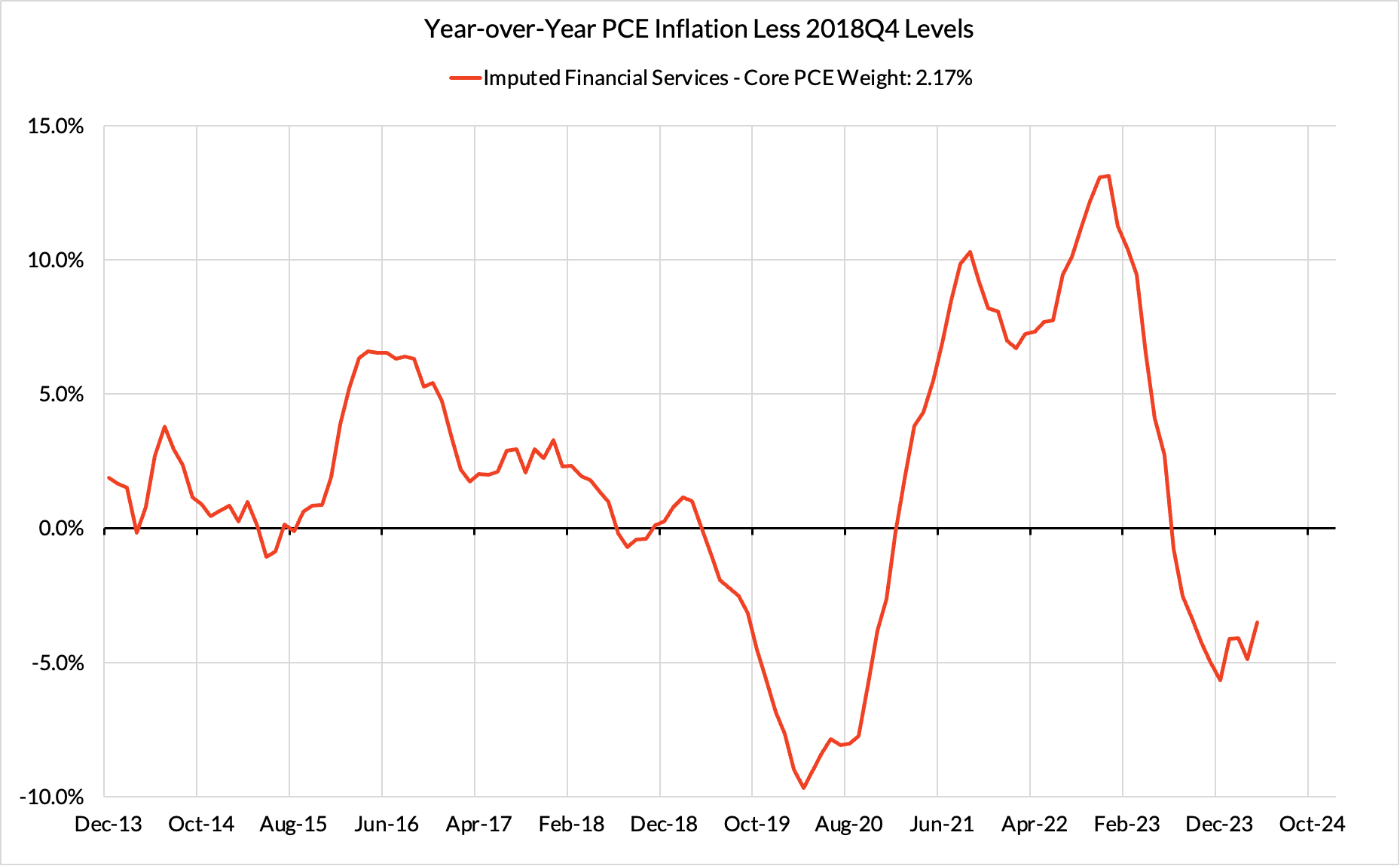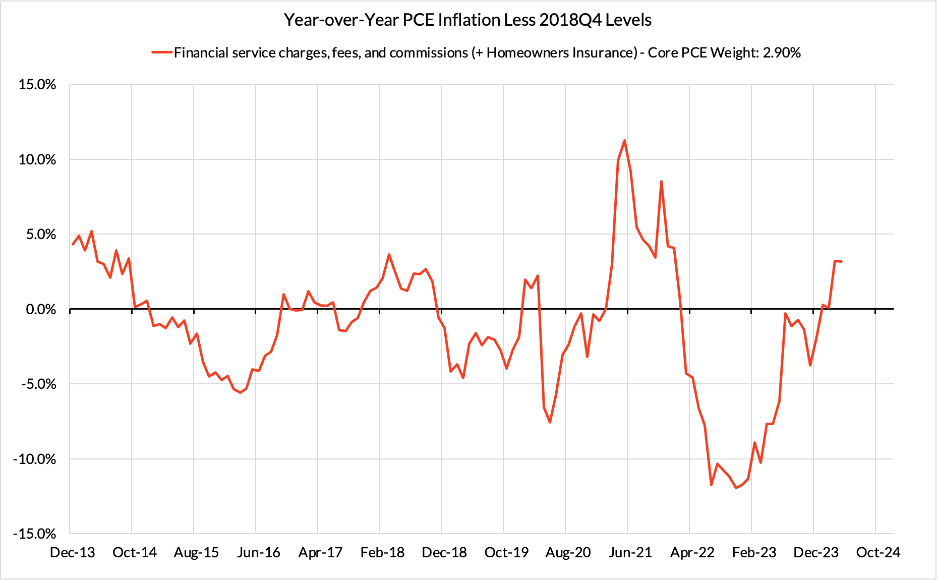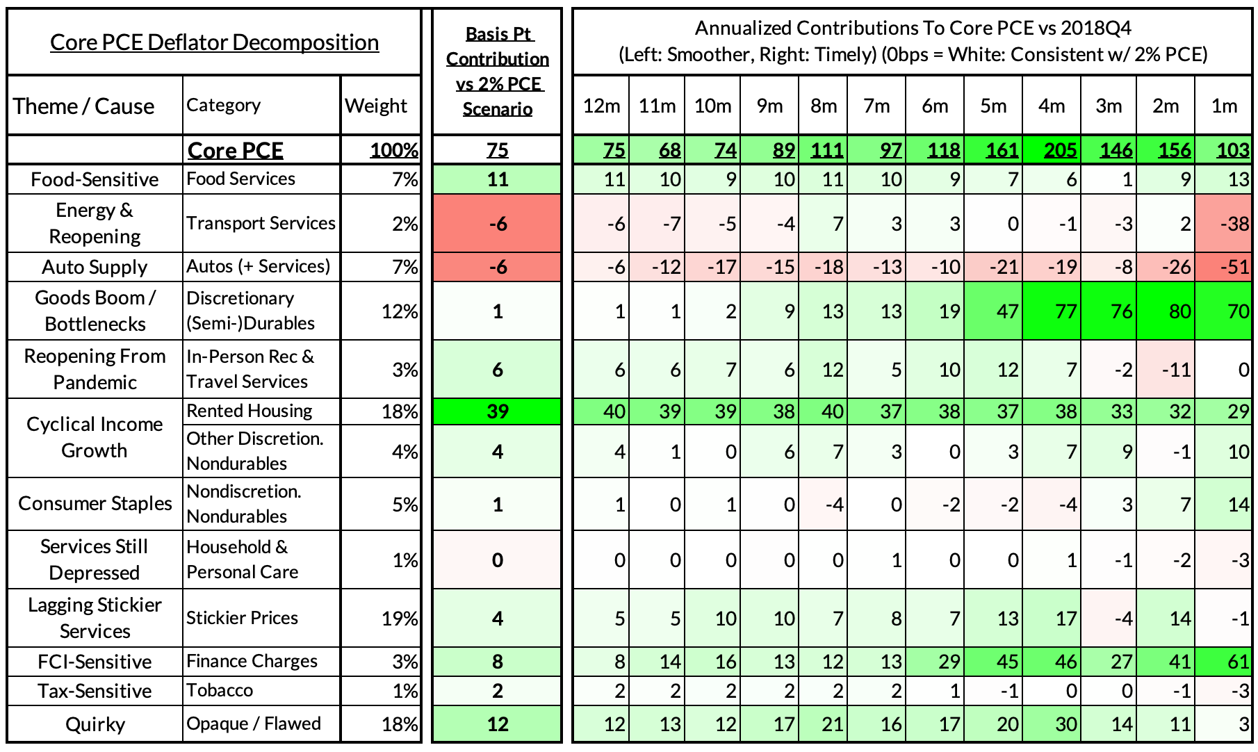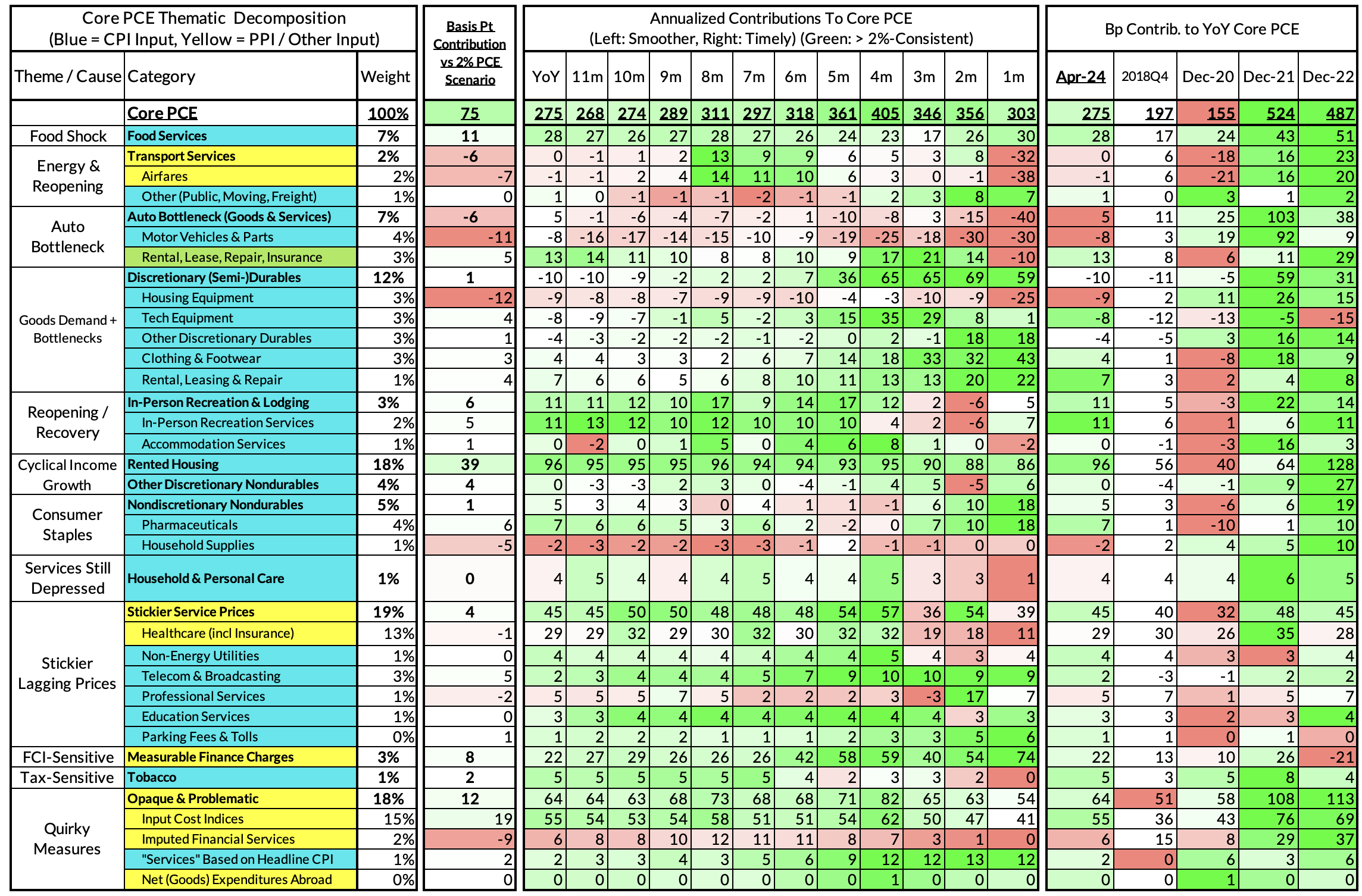 - Some oddball segments have aggravating effects (measured financial service charges now likely adding 8 basis points, while contributions from input cost indices adding 19 basis points to Core PCE vs 2%-consistent outcomes).