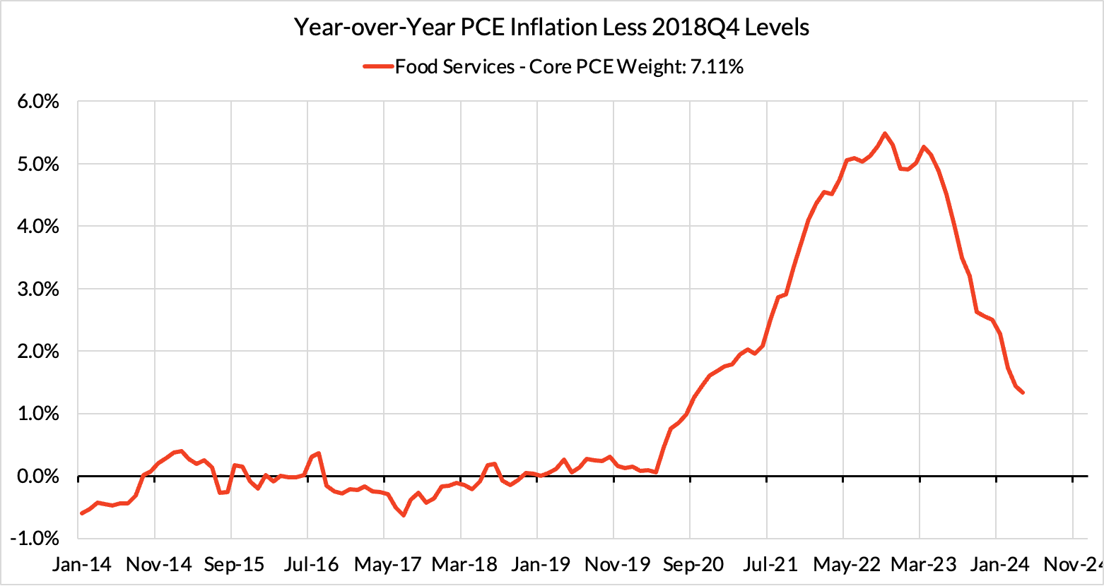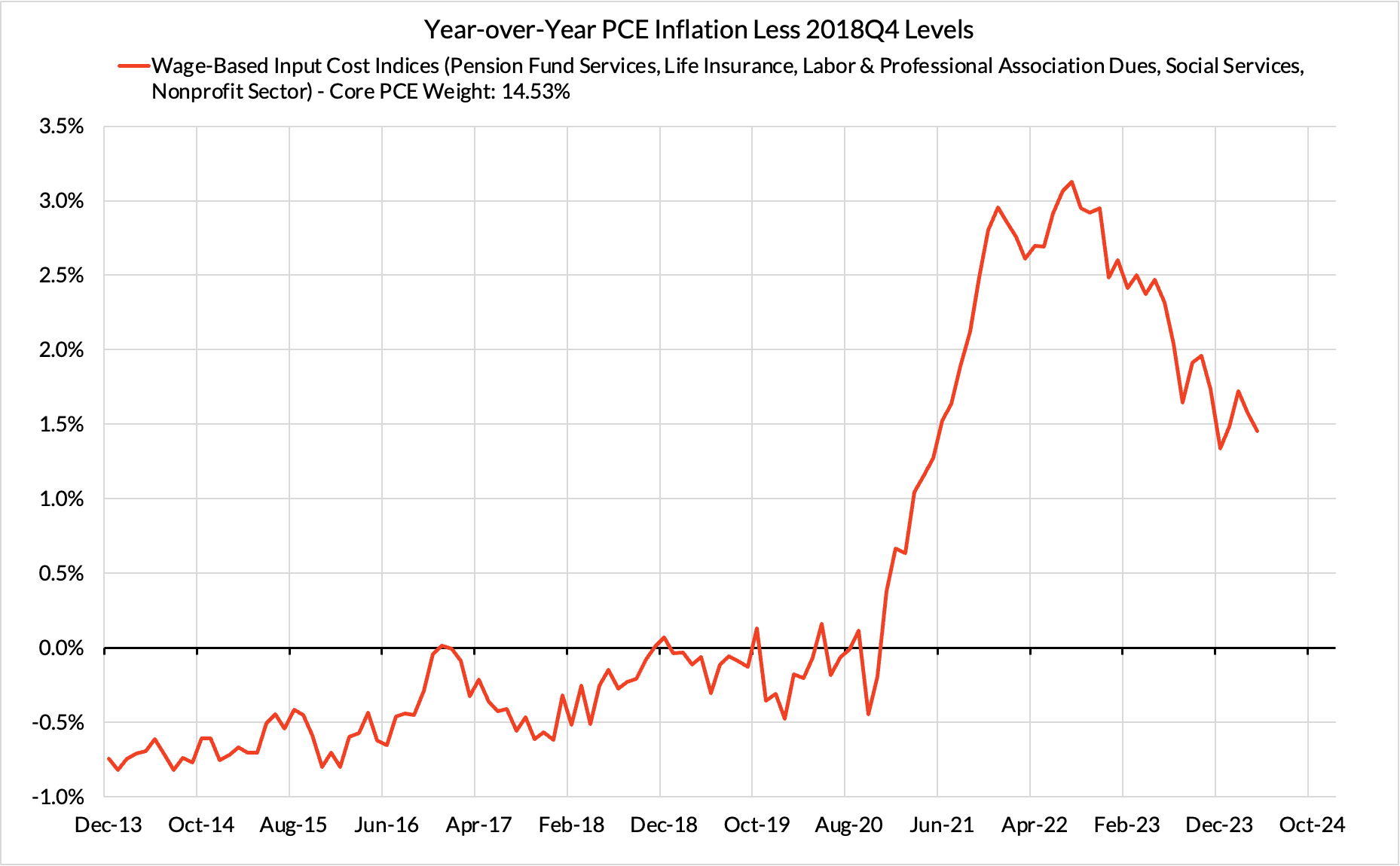 Core PCE still remains 75 basis points above the Fed's 2% target, but most of this overshoot is about the BLS' measures of rented housing inflation (including Owners' Equivalent Rent). To the extent other components are worth flagging for the year-over-year overshoot, food services, measured financial service charges, and flawed wage-based input cost indices are secondary culprits.