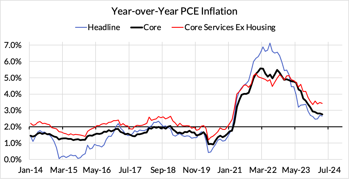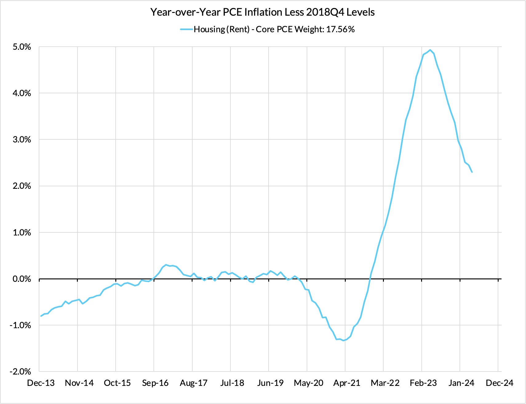 Core PCE (PCE less food products and energy) ran at a 2.75% year-over-year pace as of April, 75 basis points above the Fed's 2% inflation target for PCE. That overshoot is disproportionately driven by catch-up rent CPI inflation in response to the surge in household formation (a byproduct of rapidly recovering job growth) and market rents in 2021-22. Rent is contributing 39 basis points to the 75 basis point core PCE overshoot.