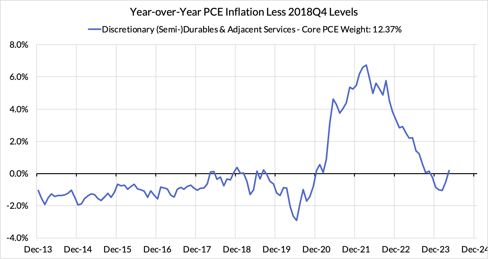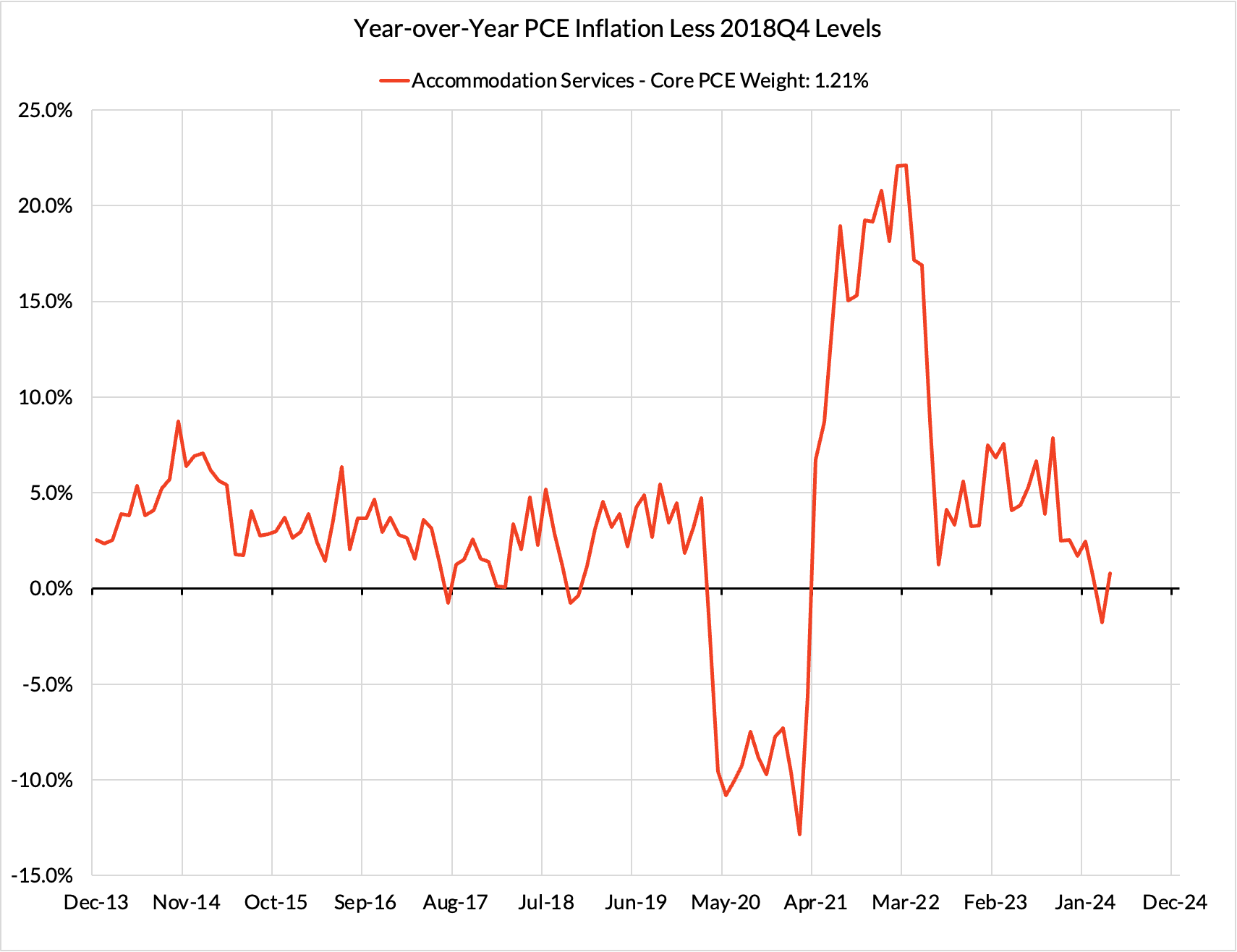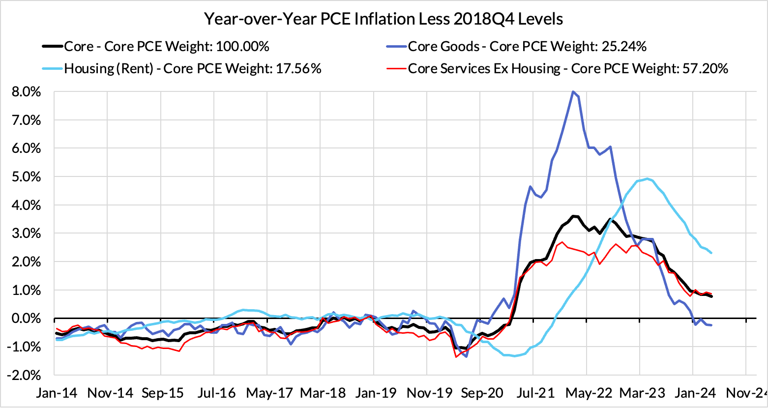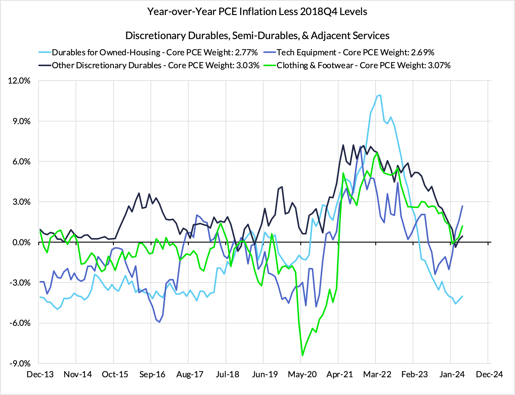 There are other segments of PCE inflation that have run strong to start 2024, particularly within goods. Apparel inflation has run strong, though the highly seasonal nature of apparel pricing also drives much of its local volatility month to month and quarter to quarter. Information technology goods prices were rapidly deflating in the final two quarters of last year but the end of aggressive discounting has translated into stronger inflation in Q1. Overall, core goods pricing has ran at a satisfactory pace for Core PCE to hit 2%, provided that core services pricing show more signs of normalization.
