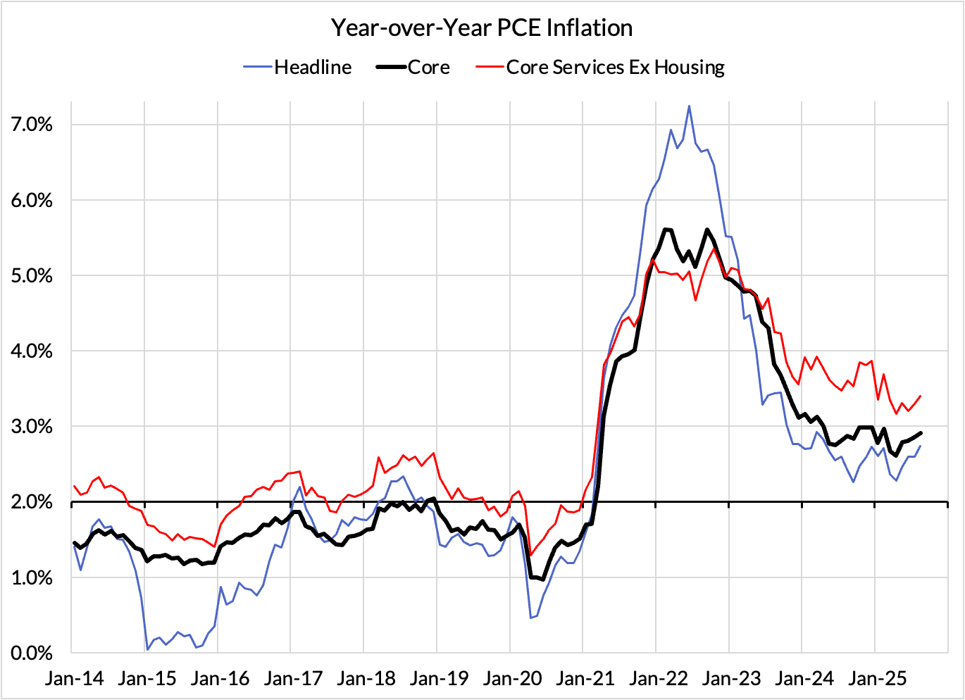The upside surprise ultimately placed the reading more firmly in line with the nowcasting consensus and still fails to serve as a material surprise for the FOMC, which was likely anticipating a 2.9% y/y Core PCE reading. Nevertheless, this upside surprise for us makes us more confident that Core PCE will not materially underperform the Fed's lofty 3.1% y/y Core PCE projection for 2025Q4. On the other hand, the Fed continues to pencil a 4.5% unemployment rate for 2025Q4, well-above what the current trajectory of the labor market and activity suggests.