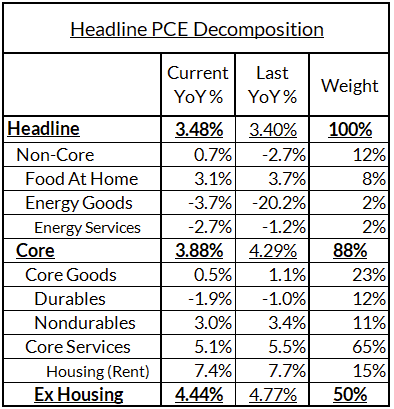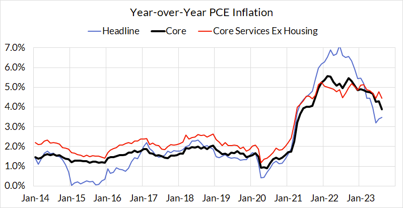 John Williams comments today signal to us that the Fed will belatedly acknowledge progress on Core PCE. Even under conservative assumptions, core PCE should underperform the median FOMC member's projections for year-end. 3.7% Y/Y Core PCE in 2023Q4 would merely require monthly readings to average 32 basis points. 20 basis points are probably a better baseline. 3.3-3.5% is the more likely range for Core PCE to end the year.