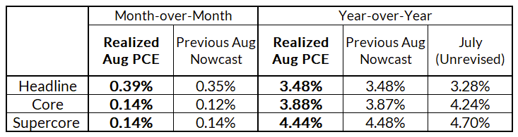 Bottom Line: There wasn't much new info in this monthly PCE release relative to our nowcasts; merely confirmation that core PCE is indeed running at 3.9% Y/Y, and 2.2% on 3-month annualized basis. The median FOMC member's core PCE projections for 2023Q4 continue to look ripe for downward revision (from 3.7% Y/Y to 3.3-3.5% Y/Y). We are therefore not moving our baseline Fed outlook: (1) no hike in Q4 and (2) the Fed will begin cutting in summer 2024. It's possible the Fed could cut in May 2024, but it's difficult to see earlier cuts in the absence of material hard landing risk emerging.