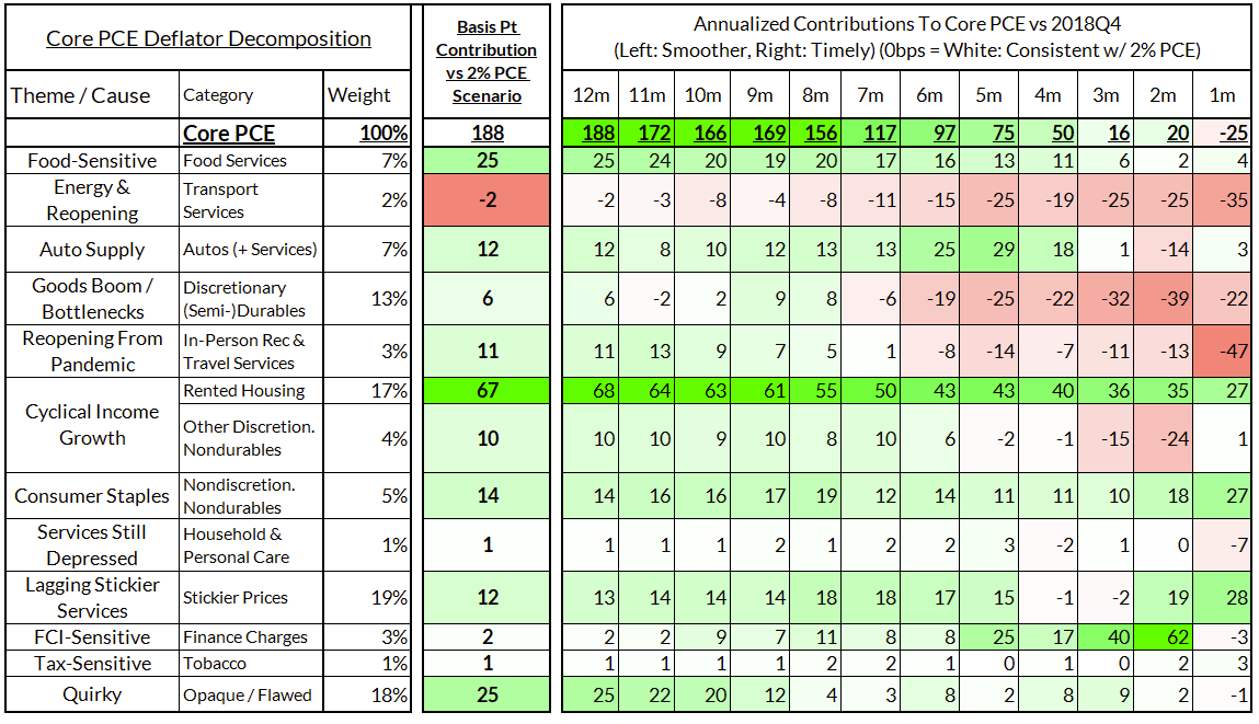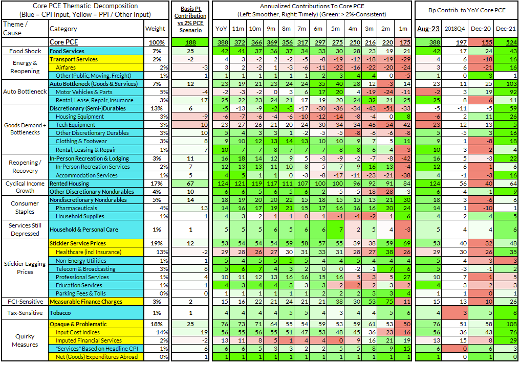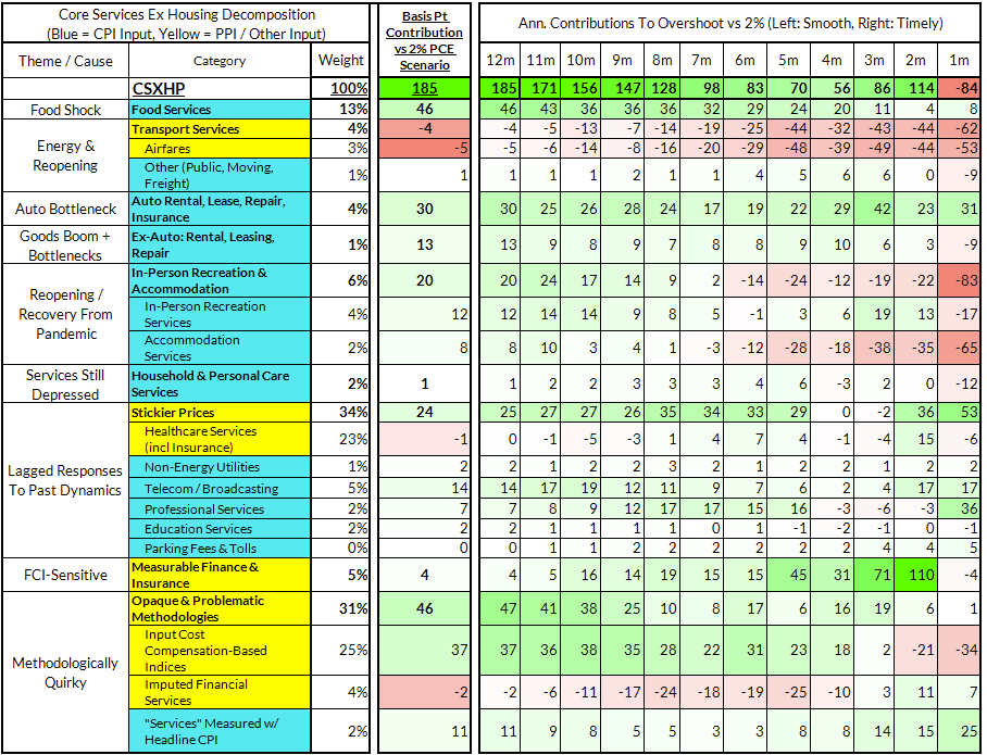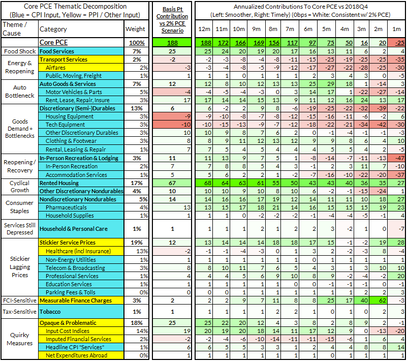 - Some oddball segments have offsetting effects (measured financial service charges now adding 2 basis points, while contributions from input cost indices and imputed financial services add 17 basis points to Core PCE vs 2%-consistent outcomes).