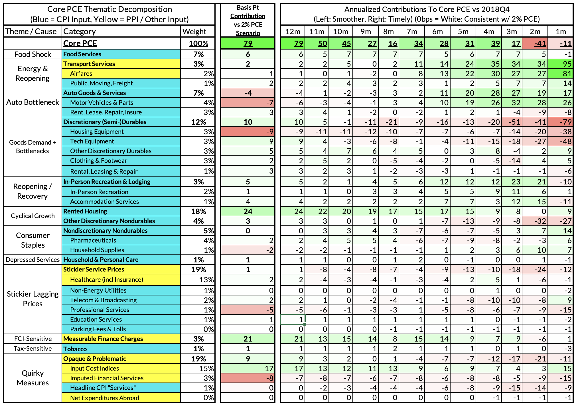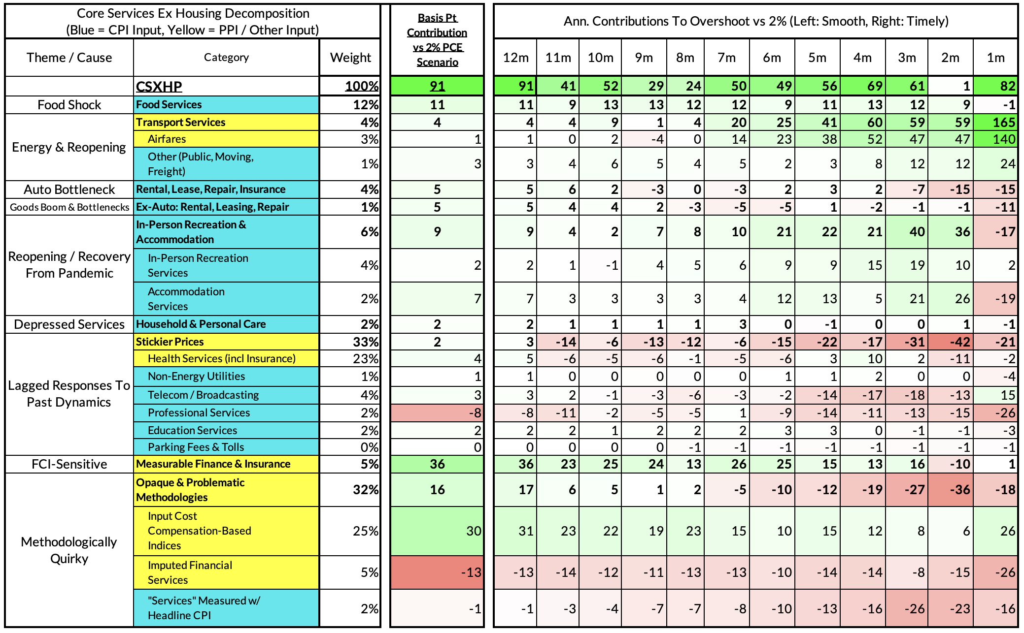 - Some contributors are more supply-driven (food inputs likely adding 6 basis points to the overshoot, unwinding motor vehicle bottlenecks now likely subtracting 4 basis points after being a substantial contributor)