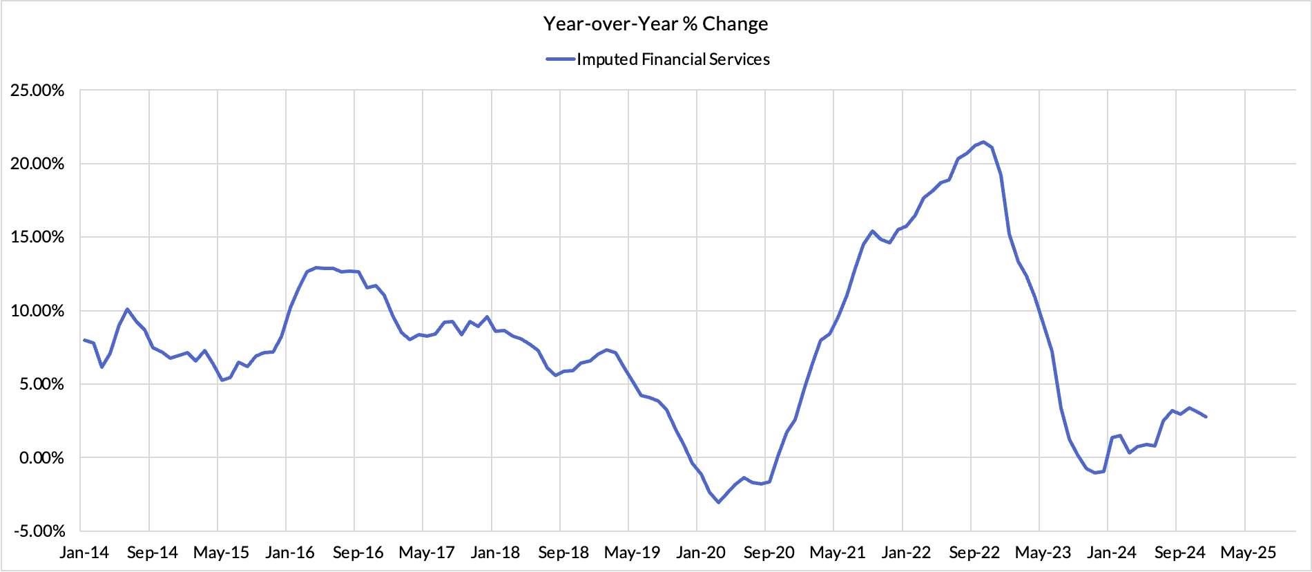 - What caught us offsides: Imputed Financial Services. Among the things that caught us out this month was the scale of disinflation and downward revision to prices "financial services furnished without payment."