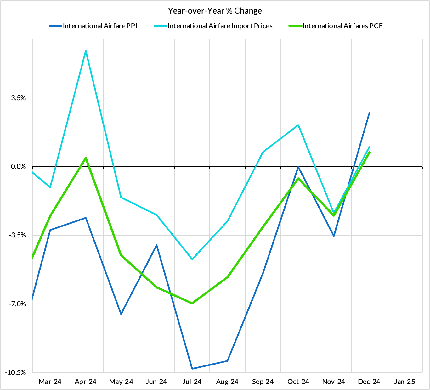 - What caught us offsides: International Airfares. We had penciled in a more aggressive view on international airfares PCE based on the performance of the two source data inputs, both of which are now outperforming their PCE analogue.