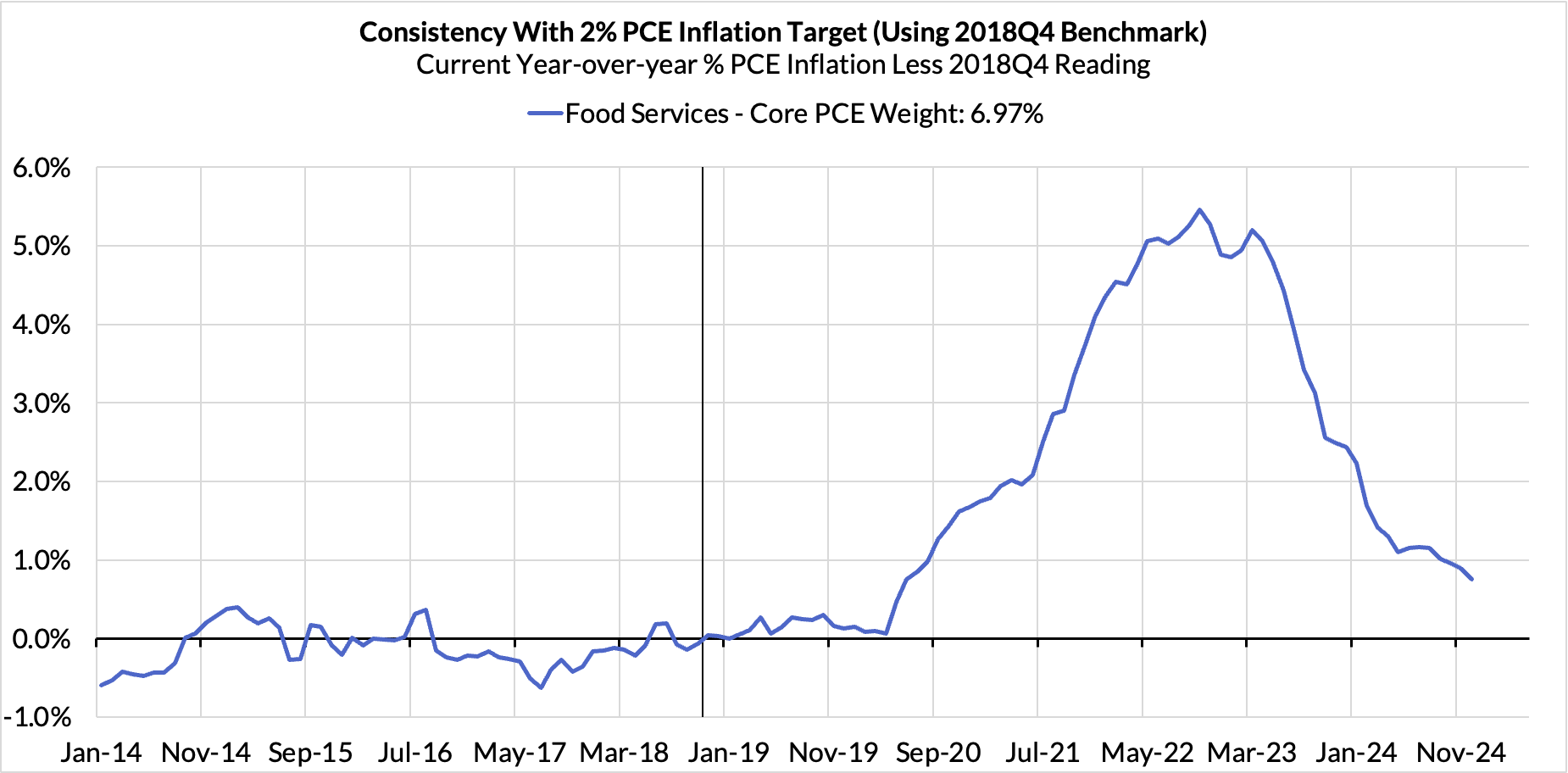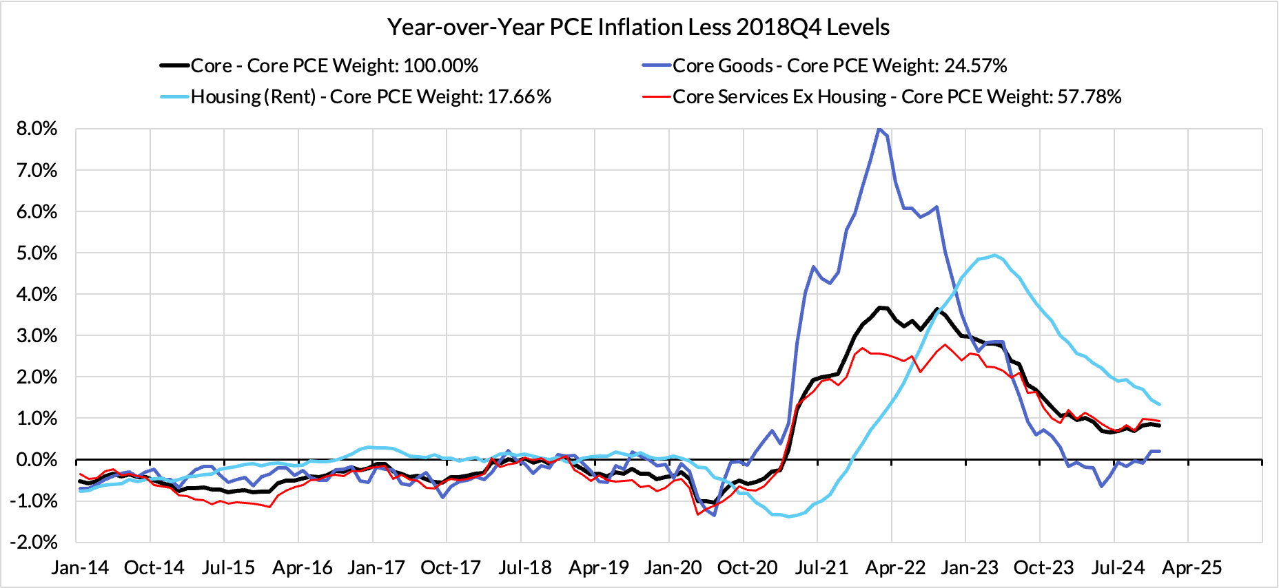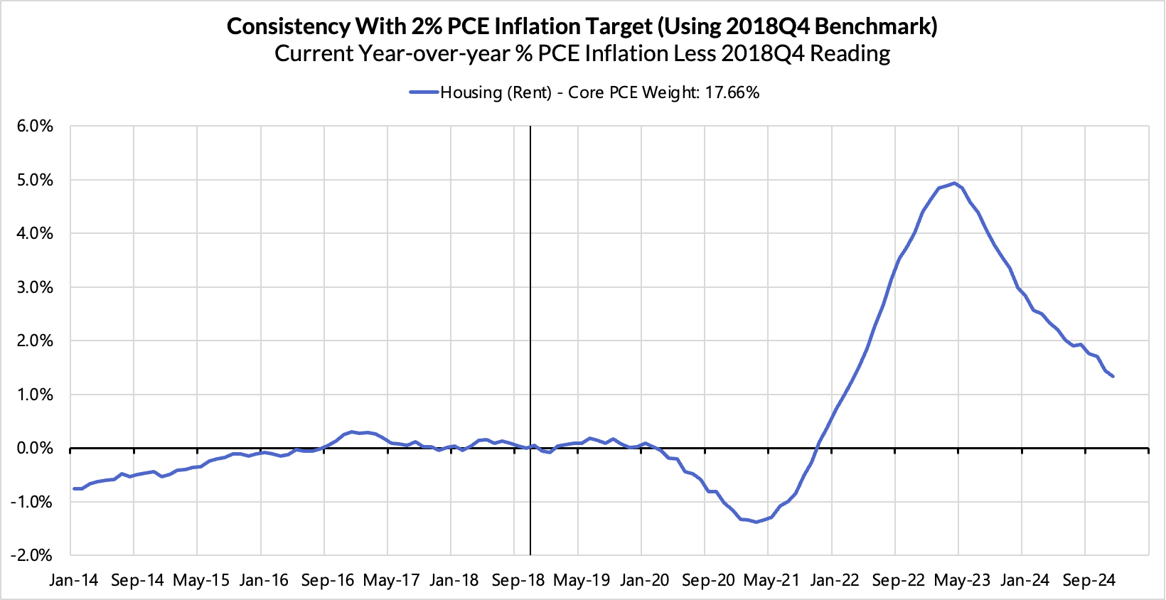 Right now Core PCE (PCE less food products and energy) is running at a 2.79% year-over-year pace as of December, 79 basis points above the Fed's 2% inflation target for PCE. That projected overshoot is disproportionately driven by catch-up rent CPI inflation in response to the surge in household formation (a byproduct of rapidly recovering job growth) and market rents in 2021-22. Rent is on track to contribute 24 basis points to the 79 basis point Core PCE overshoot.