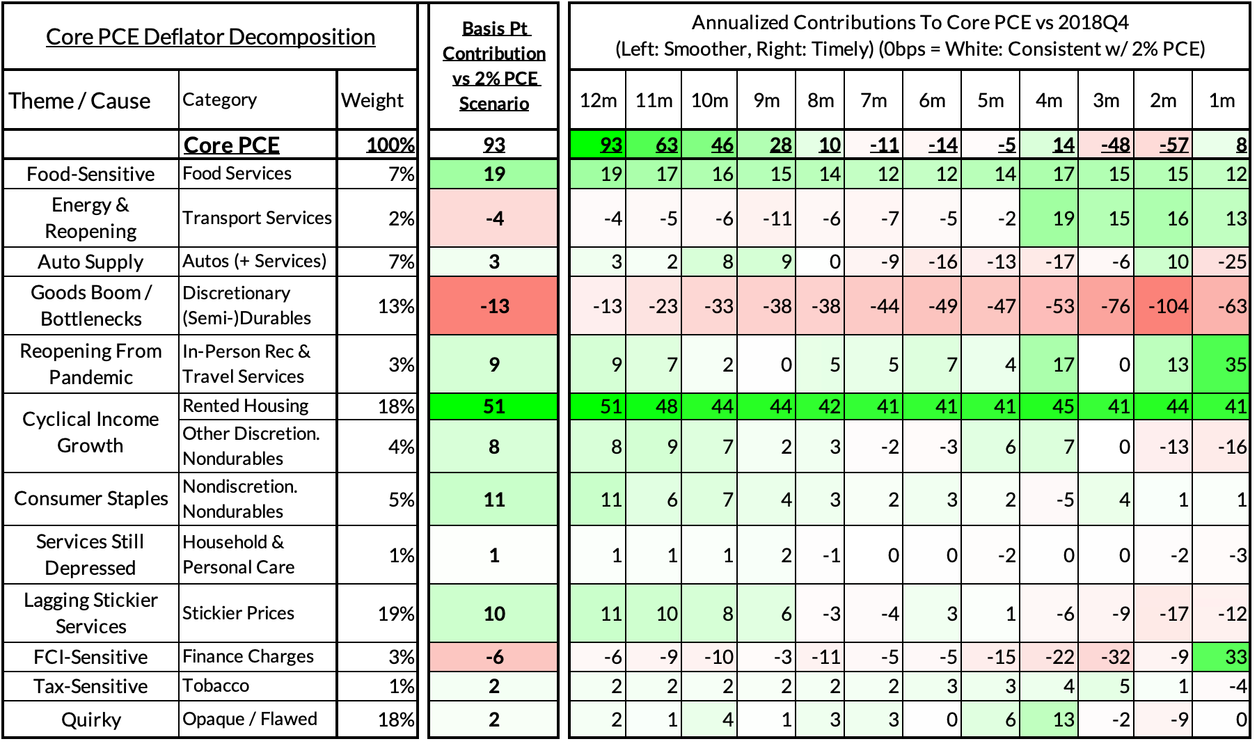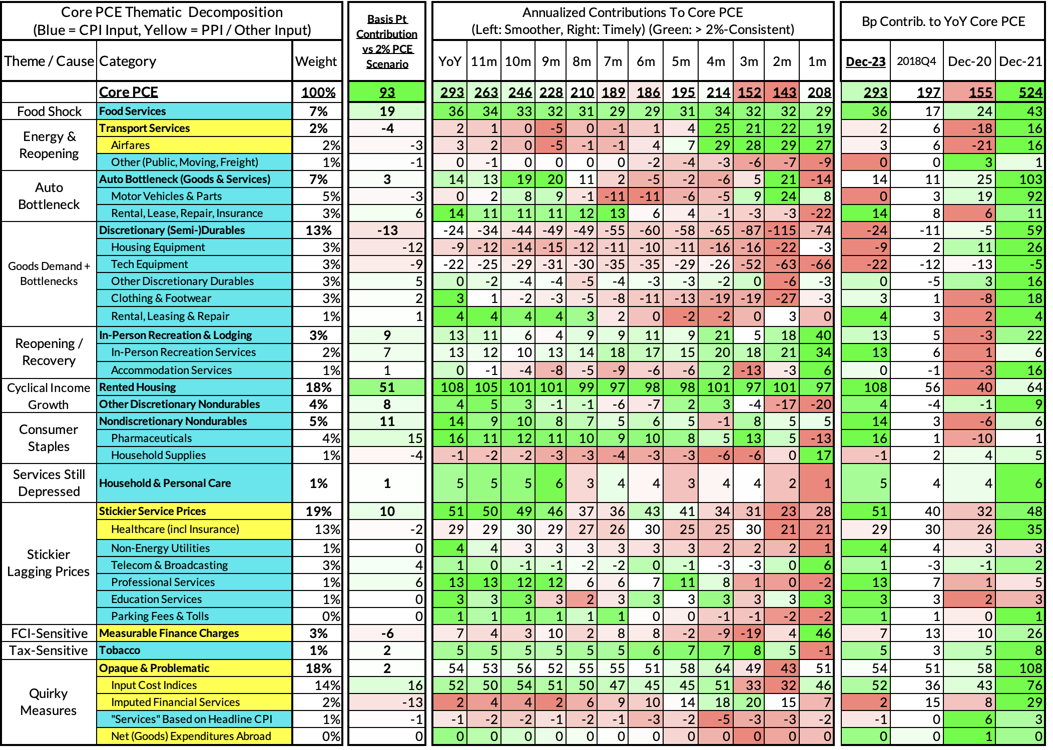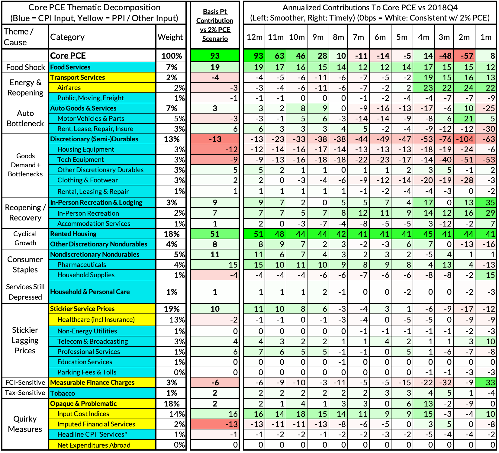 - Some oddball segments have offsetting effects (measured financial service charges now subtracting 6 basis points, while contributions from input cost indices and imputed financial services likely adding 3 basis points to Core PCE vs 2%-consistent outcomes).