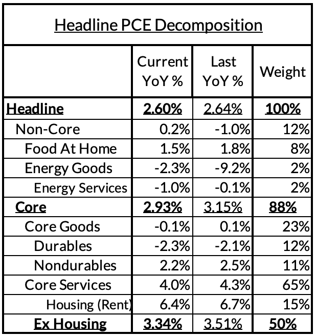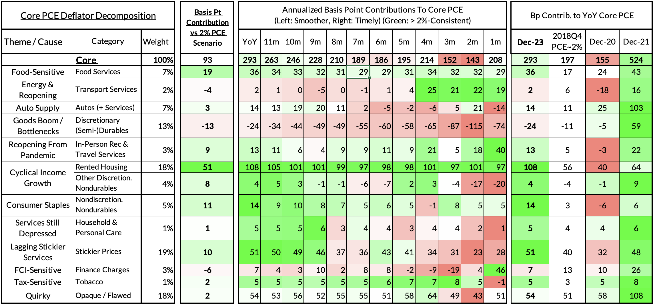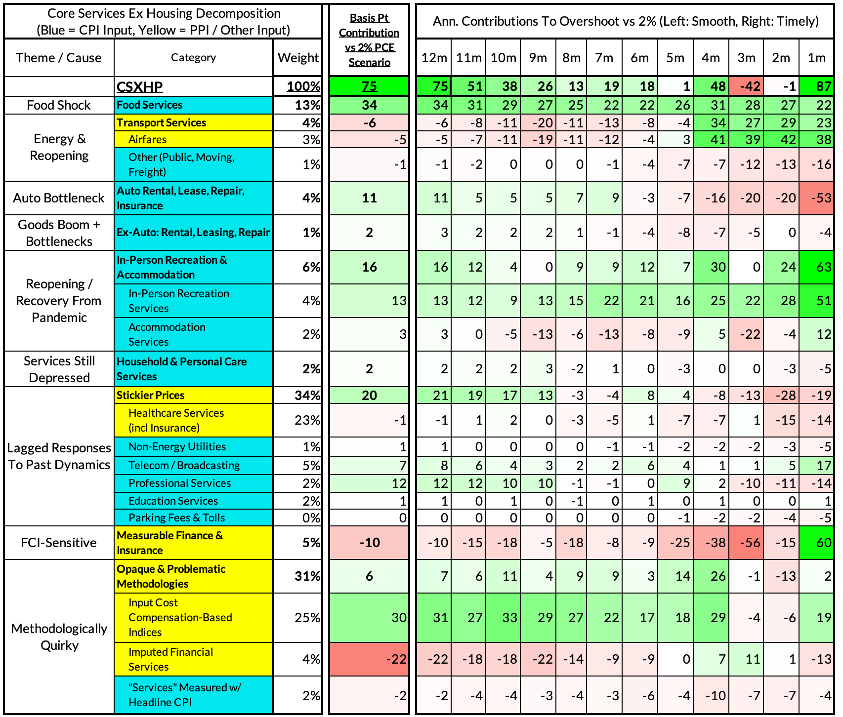 - Some oddball segments have offsetting effects (measured financial service charges now subtracting 6 basis points, while contributions from input cost indices and imputed financial services likely adding 3 basis points to Core PCE vs 2%-consistent outcomes).