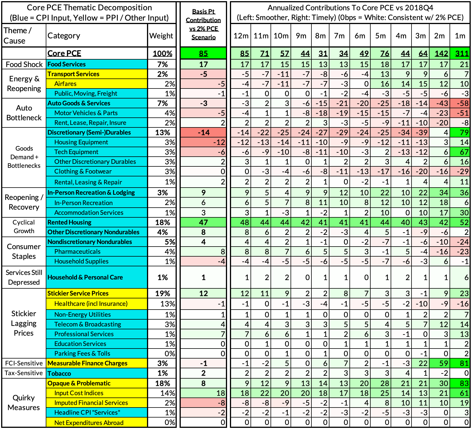 - Some oddball segments have offsetting effects (measured financial service charges now likely subtracting 1 basis point, while contributions from input cost indices and imputed financial services likely adding 10 basis points to Core PCE vs 2%-consistent outcomes).