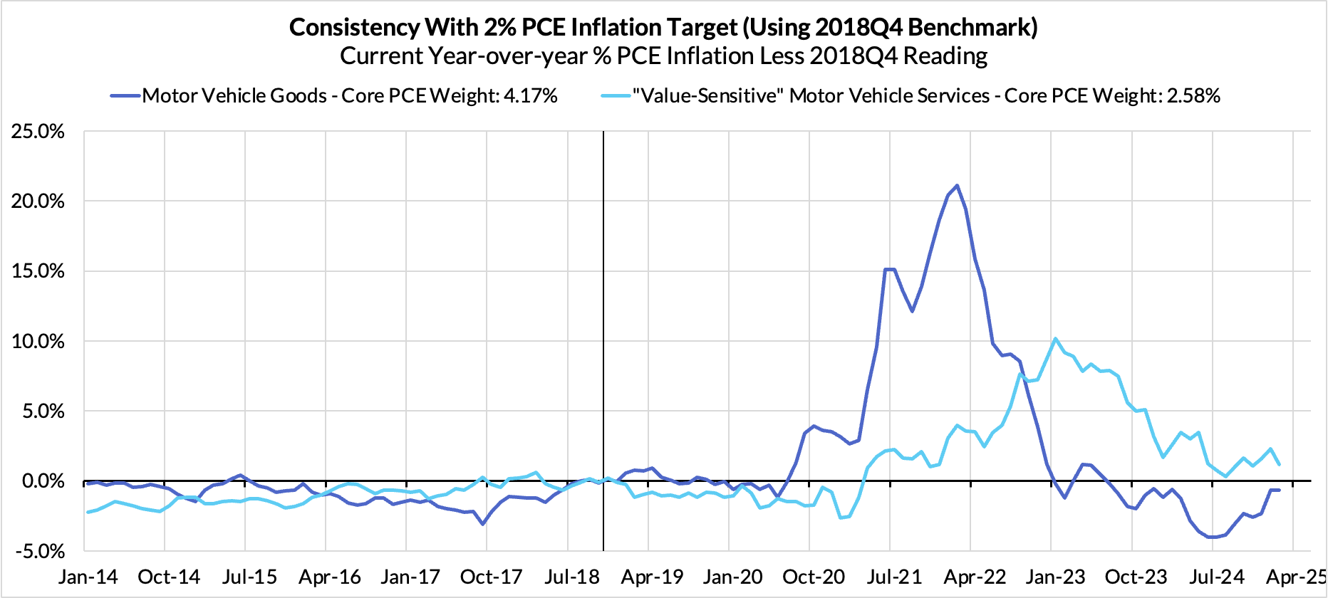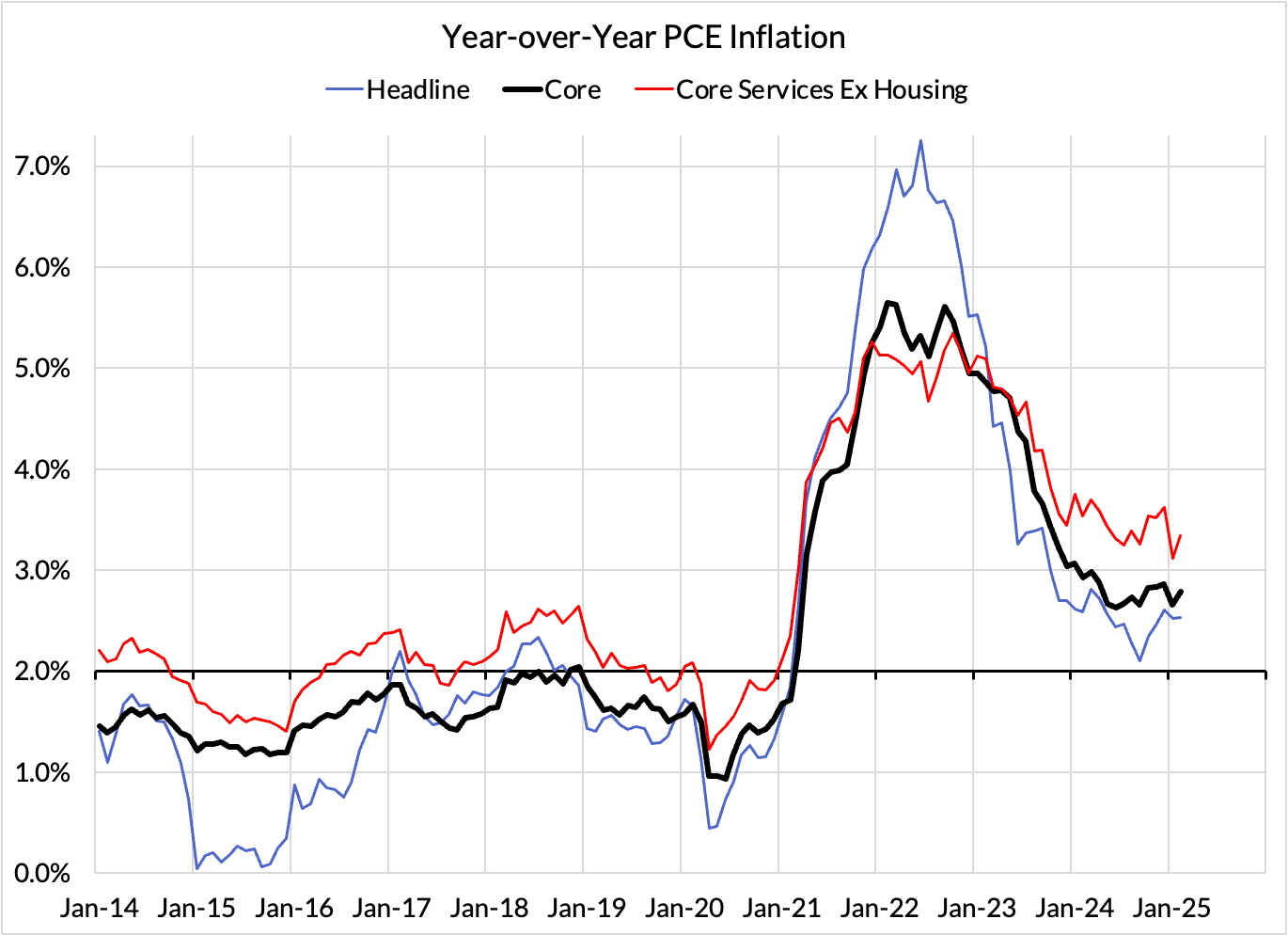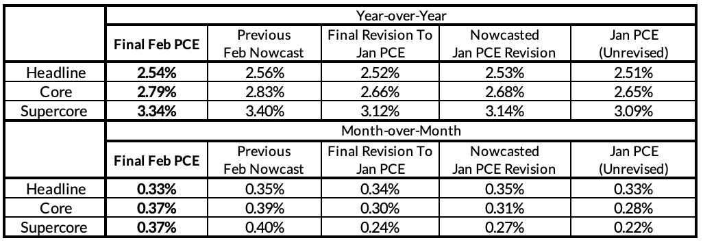 Our PCE Nowcasts were a touch high relative to what materialized but closer than most of the informed consensus in recognizing the likelihood of a 0.4% monthly reading. The data for February and the revisions for previous months bode poorly for how the Fed assesses the inflation outlook. We should get some short-term sources of relief in the coming months due to falling stock prices and a short-term reprieve in used car prices, but the effects of tariffs and tariff threats are poised to ramp up further over the next 2-4 months in the absence of a policy pivot.