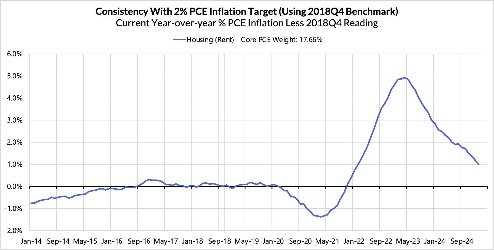 Right now Core PCE (PCE less food products and energy) is running at a 2.79% year-over-year pace as of February, 79 basis points above the Fed's 2% inflation target for PCE. That projected overshoot is still driven substantially by catch-up rent CPI inflation in response to the surge in household formation (a byproduct of rapidly recovering job growth) and market rents in 2021-22. Rent is on track to contribute 18 basis points to the 79 basis point Core PCE overshoot.