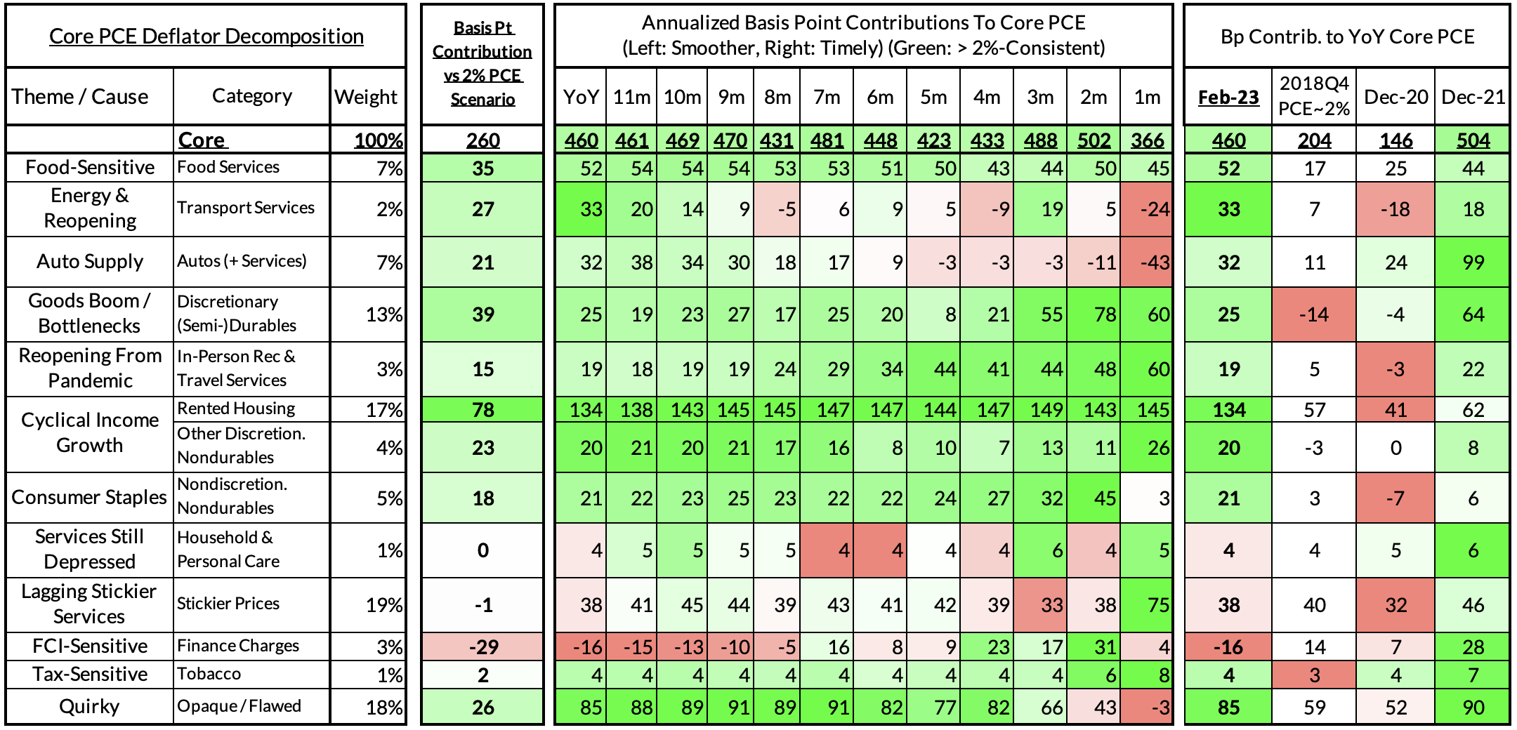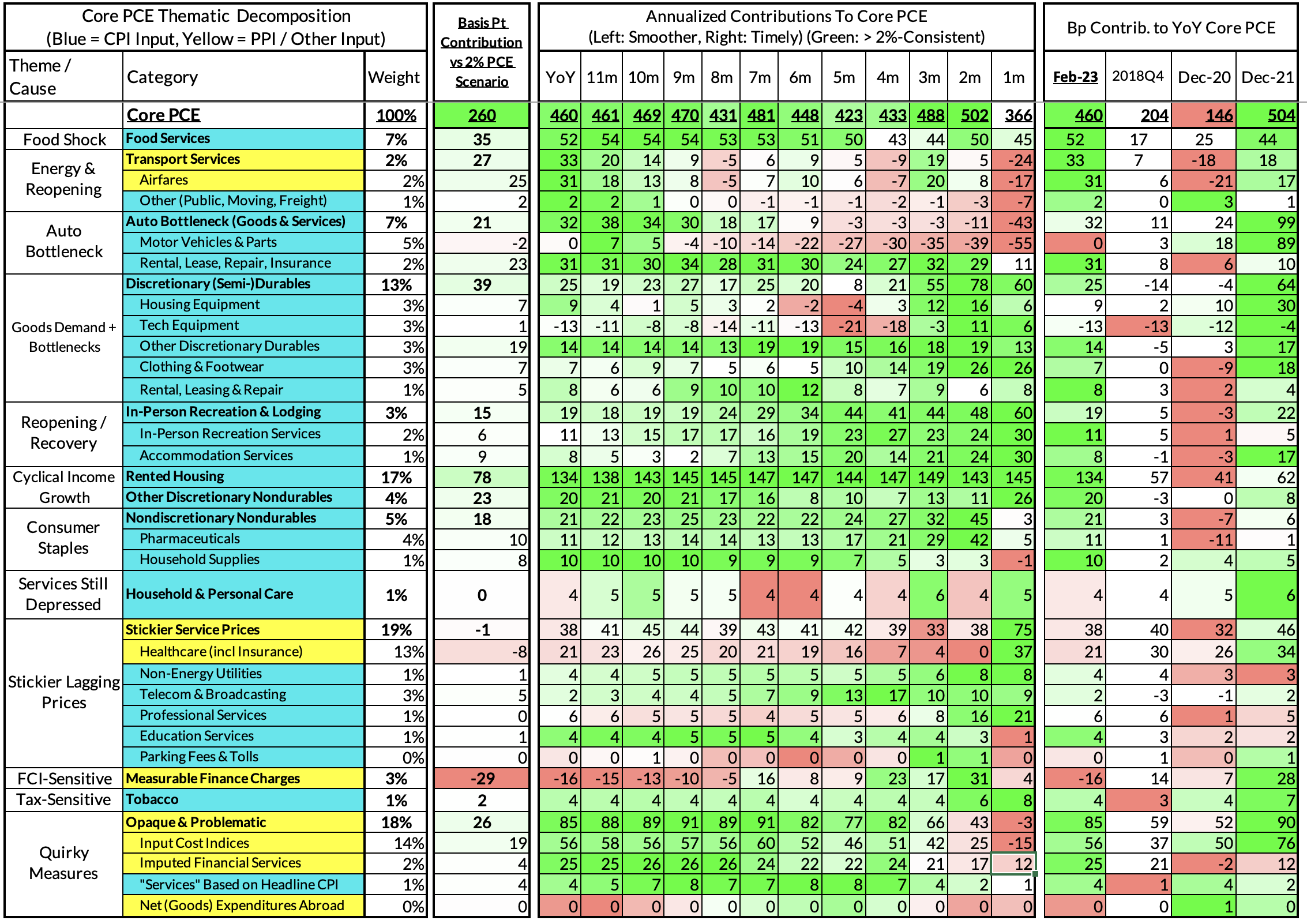 The final heatmap gives you a sense of the overshoot on shorter annualized run-rates. February's monthly core PCE yielded a 162 basis point overshoot vs 2% target inflation (3.62% annualized).