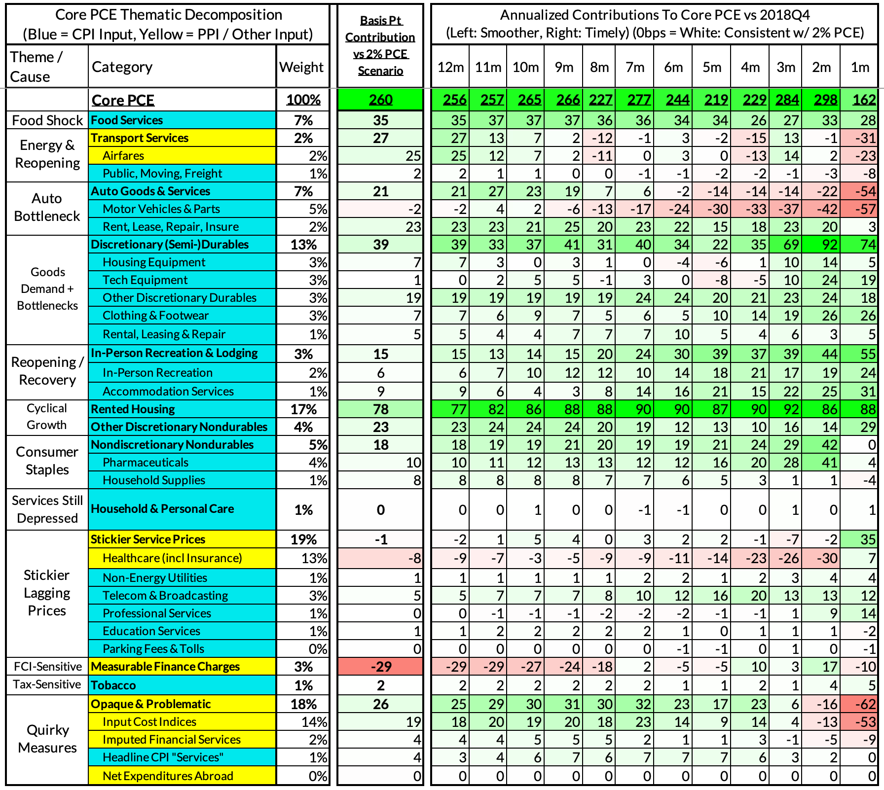 Core-Cast is our nowcasting model to track the Fed's preferred inflation gauges before and through their release date. The heatmaps below give a comprehensive view of how inflation components and themes are performing relative to what transpires when inflation is running at 2%. If you are interested in more timely access to this content following the release of data, feel free to reach out to us here to gain access to our Premium Donor distribution.