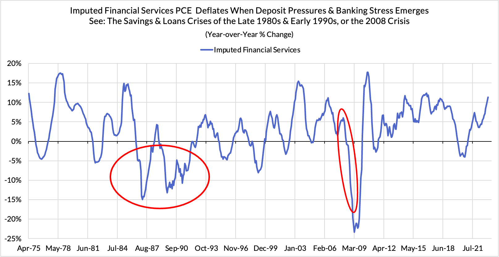 - Dark Space #1 - The scramble for deposits is creating downside potential: Premium Donors to Employ America were already aware of how upward pressures on deposit rates (relative to the Fed Funds Rate) can create deflationary potential. The less that depositors are losing on their deposit rates relative the Federal Funds Rate, the "cheaper" the bundle of imputed financial services that the Bureau of Economic Analysis assumes depositors are implicitly paying for. This single component could shave off as much as 40 basis points on Core PCE and 70 basis points on Core Services Ex Housing PCE if deposit rate pressures continue to ratchet up.