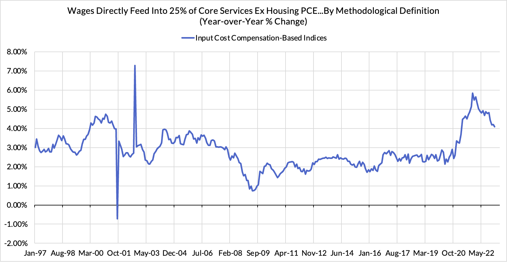 - Dark Space #2 - The decelerating wage data is starting to show up where it counts: We are very skeptical of the Fed's claims that Core Services Ex Housing PCE is driven by wage growth in a macro-causal sense. The empirical evidence does not match the Fed's presumptive claims. But there is a quarter of Core Services Ex Housing that uses wage and compensation data as the direct input for tracking "prices." 12.5% of the total PCE basket is measured not by market prices for consumption, but by input-cost compensation based indices. These two are starting to show (with some help from revisions) meaningful slowing.