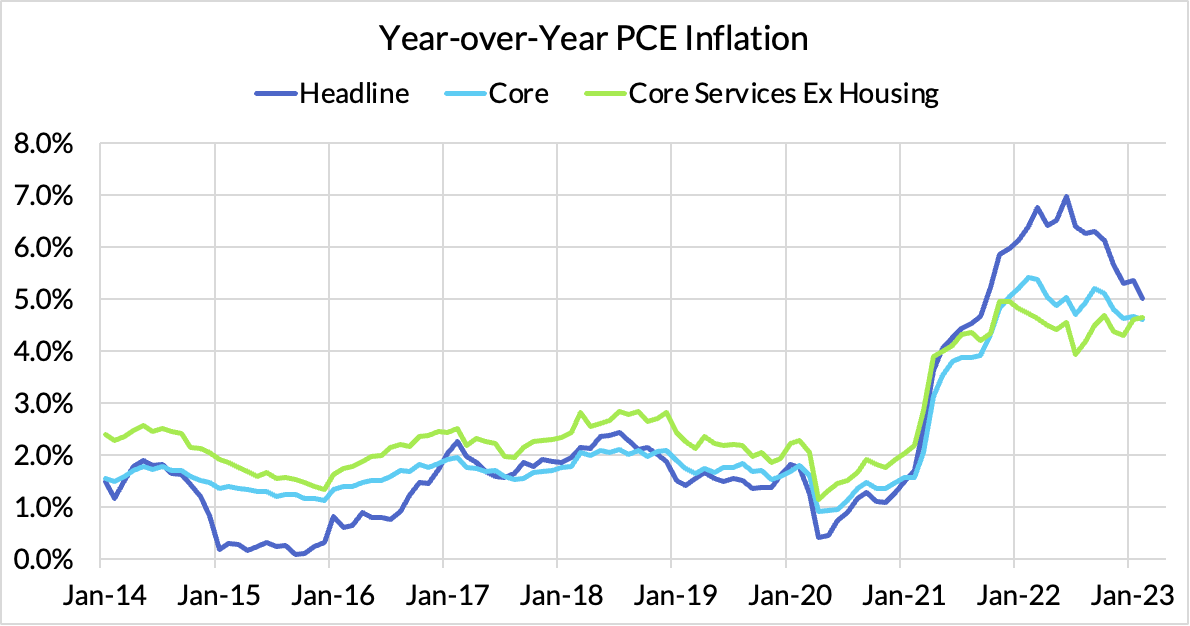 - Headline PCE fell, from 5.35%* year-over-year in January to 5.00% in February. (0.26% month-over-month increase vs our 0.31% nowcast). January year-over-year was revised down 3bps from 5.38%.