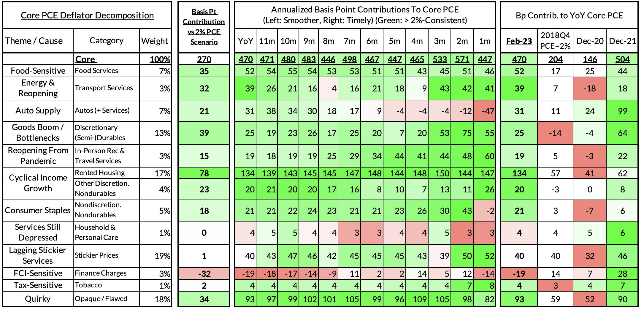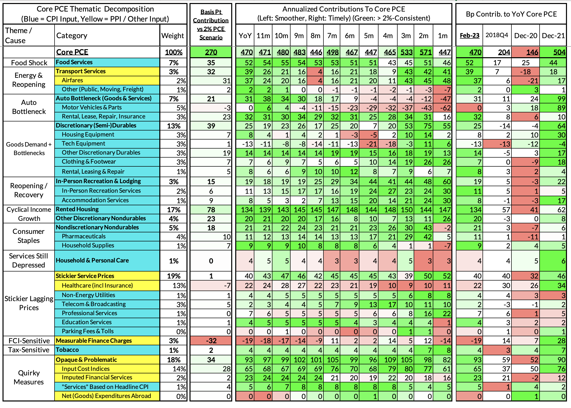 The final heatmap gives you a sense of the overshoot on shorter annualized run-rates. Right now we see February's monthly core PCE on track for a 243 basis point overshoot vs 2% (4.43% annualized growth). This estimate will inevitably shift tomorrow.