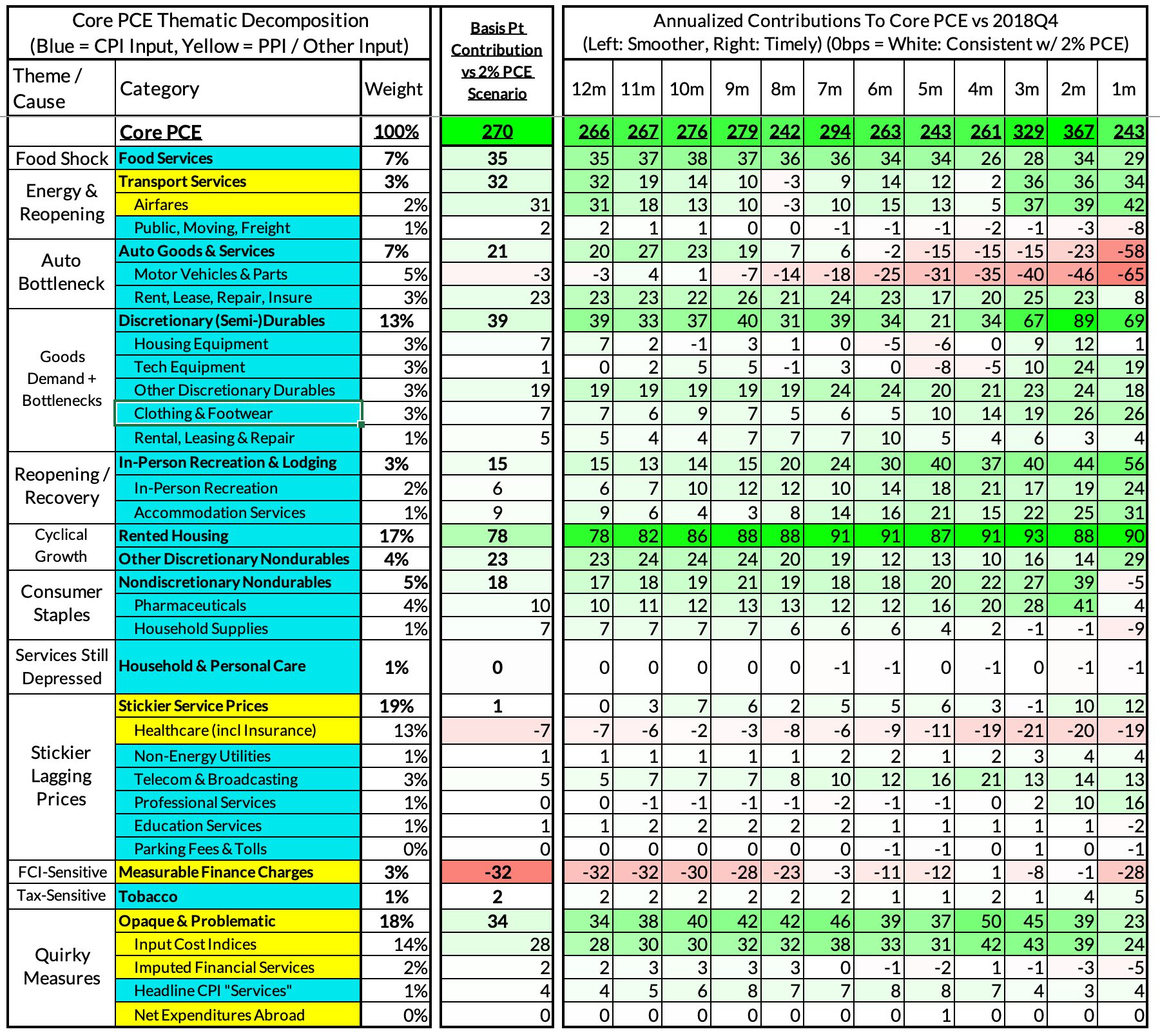 Core-Cast is our nowcasting model to track the Fed's preferred inflation gauges before and through their release date. The heatmaps below give a comprehensive view of how inflation components and themes are performing relative to what transpires when inflation is running at 2%. If you are interested in more timely access to this content following the release of data, feel free to reach out to us here to gain access to our Premium Donor distribution.