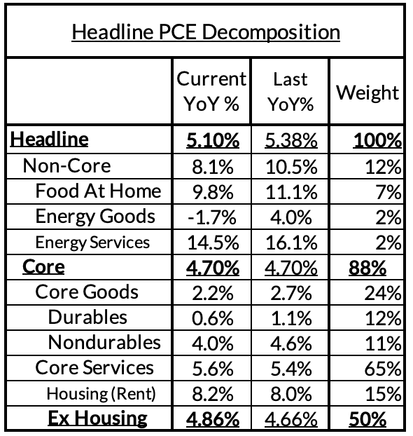 - Headline PCE is currently on track to fall, from 5.38% year-over-year in January to 5.10% in February. (0.33% month-over-month increase)